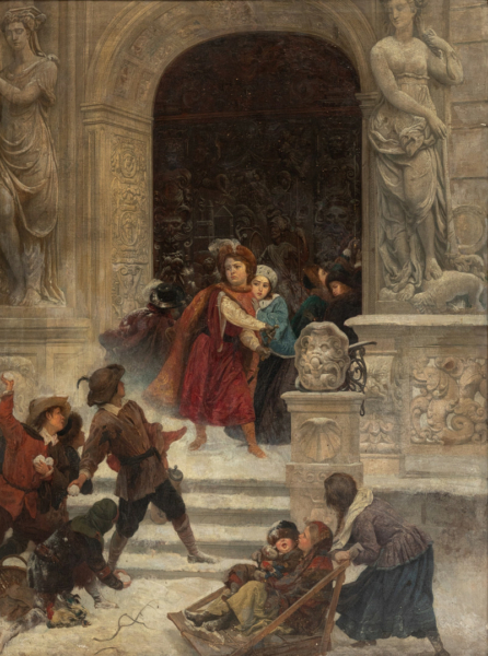 Die äußerst detailreiche Szene zeigt den herrschaftlichen Eingang zu einem Patrizierhaus in Danzig, vor dem sich eine Schar Kinder eine Schneeballschlacht liefert. Das in Stofflichkeit und Lichtführung beeindruckende Meisterwerk von musealem Rang erzielte einen Top-Zuschlag von 43.100€.