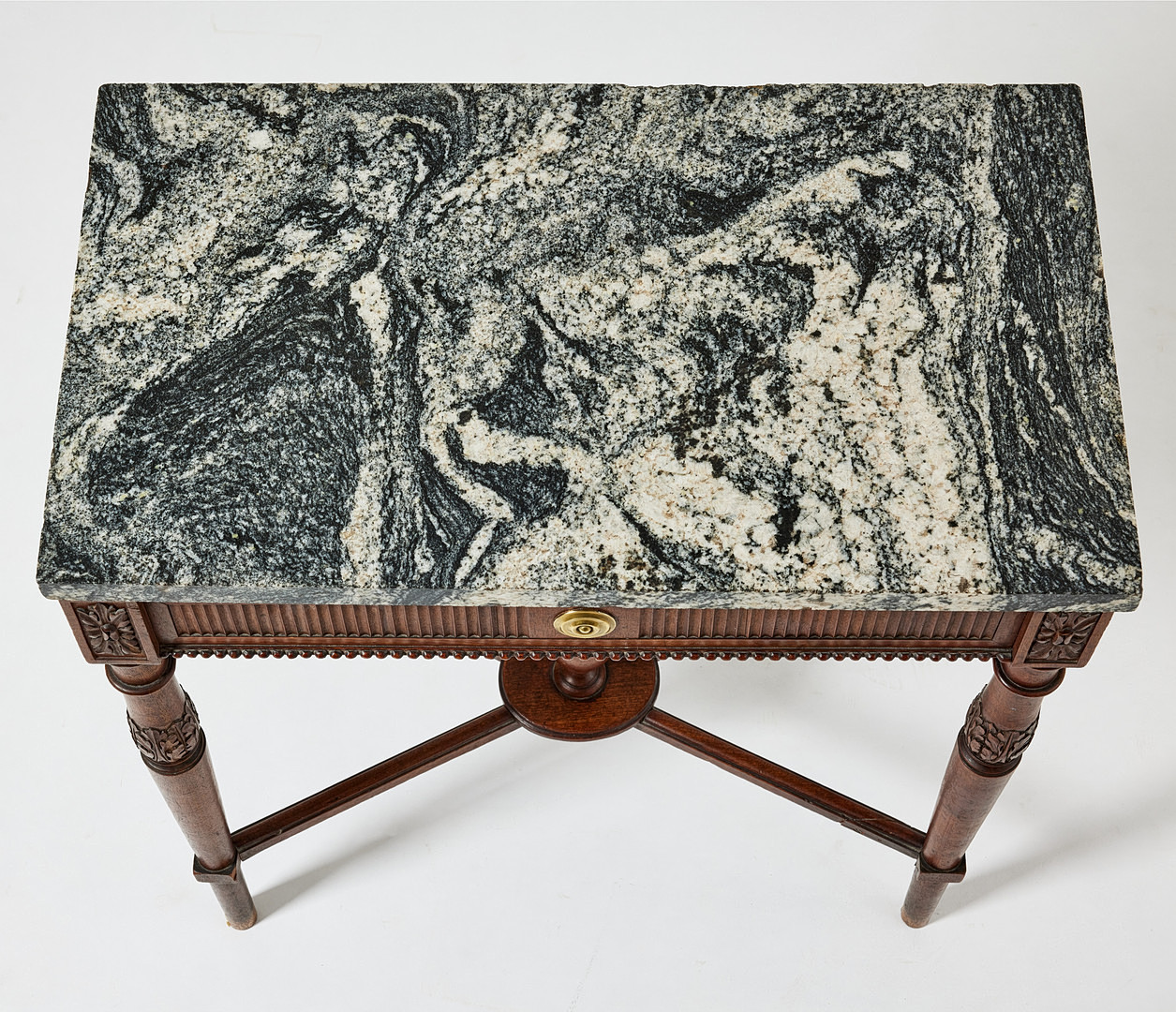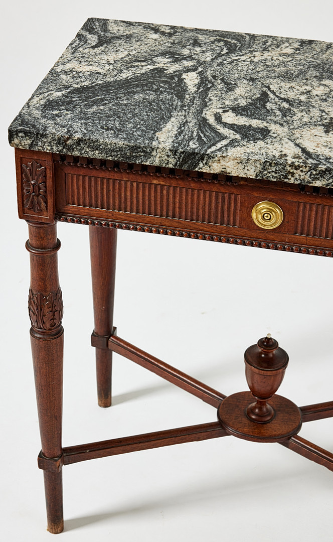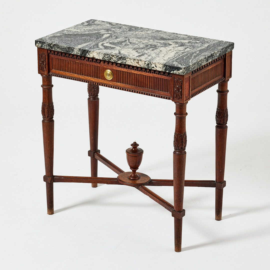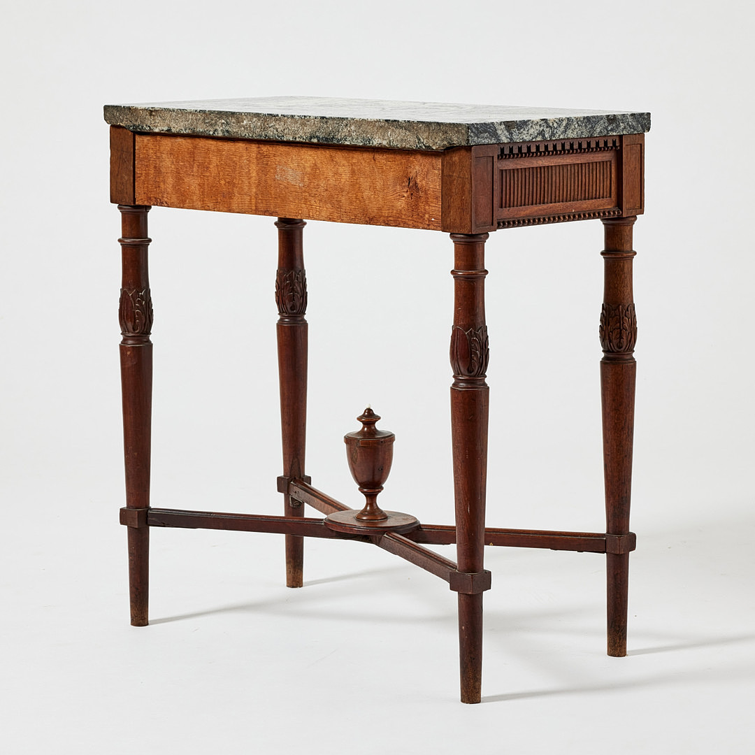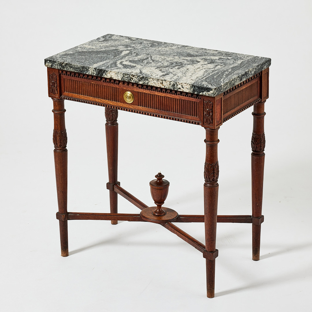 GOTTLIEB IWERSSON (mästare och hovschatullmakare i Stockholm 1778-1813, slottssnickare omkring 1784), salongsbord, högklassigt sengustavianskt stockholmsarbete, fanerad och massiv mahogny, beslag i mässing.