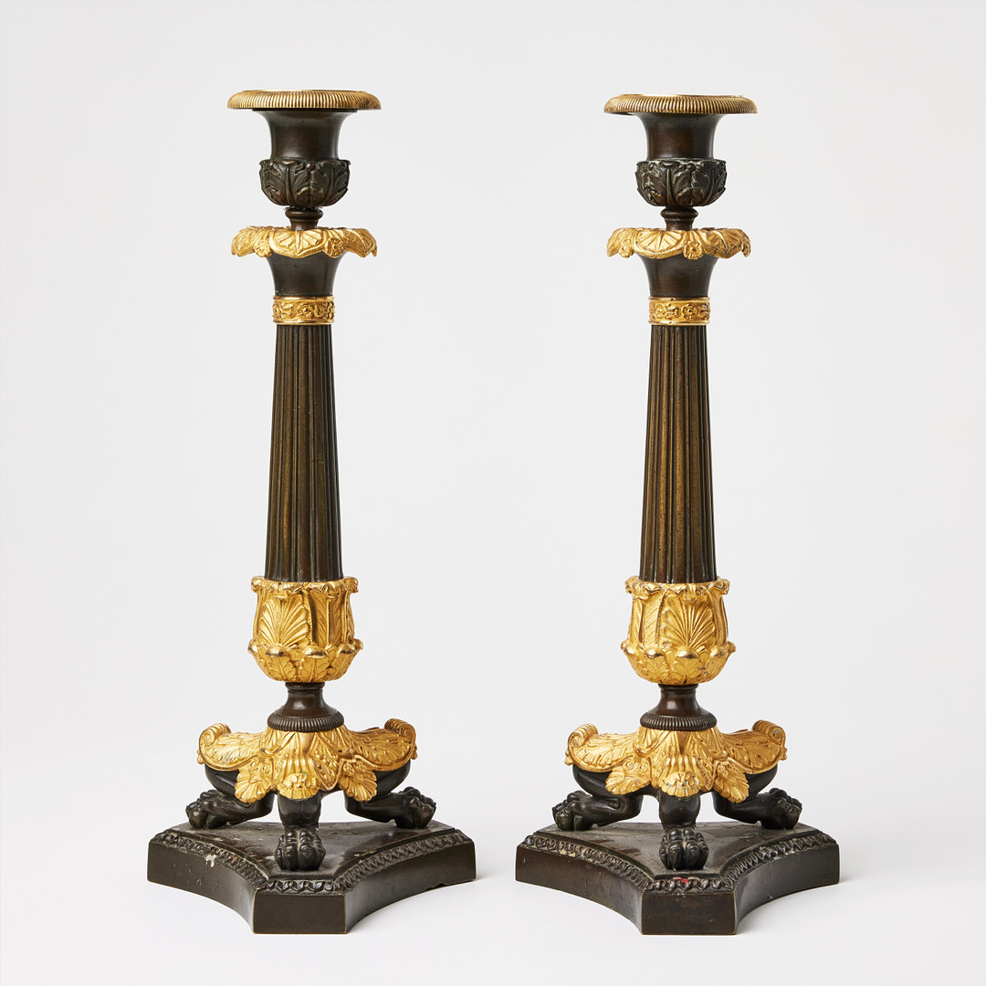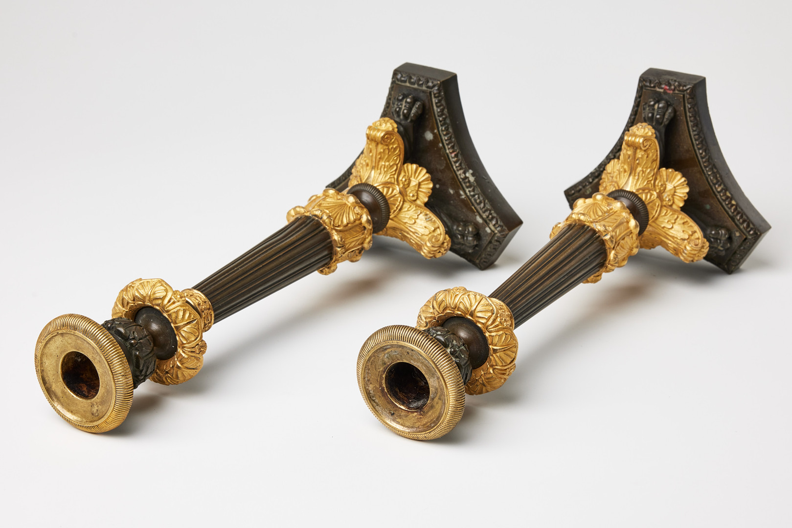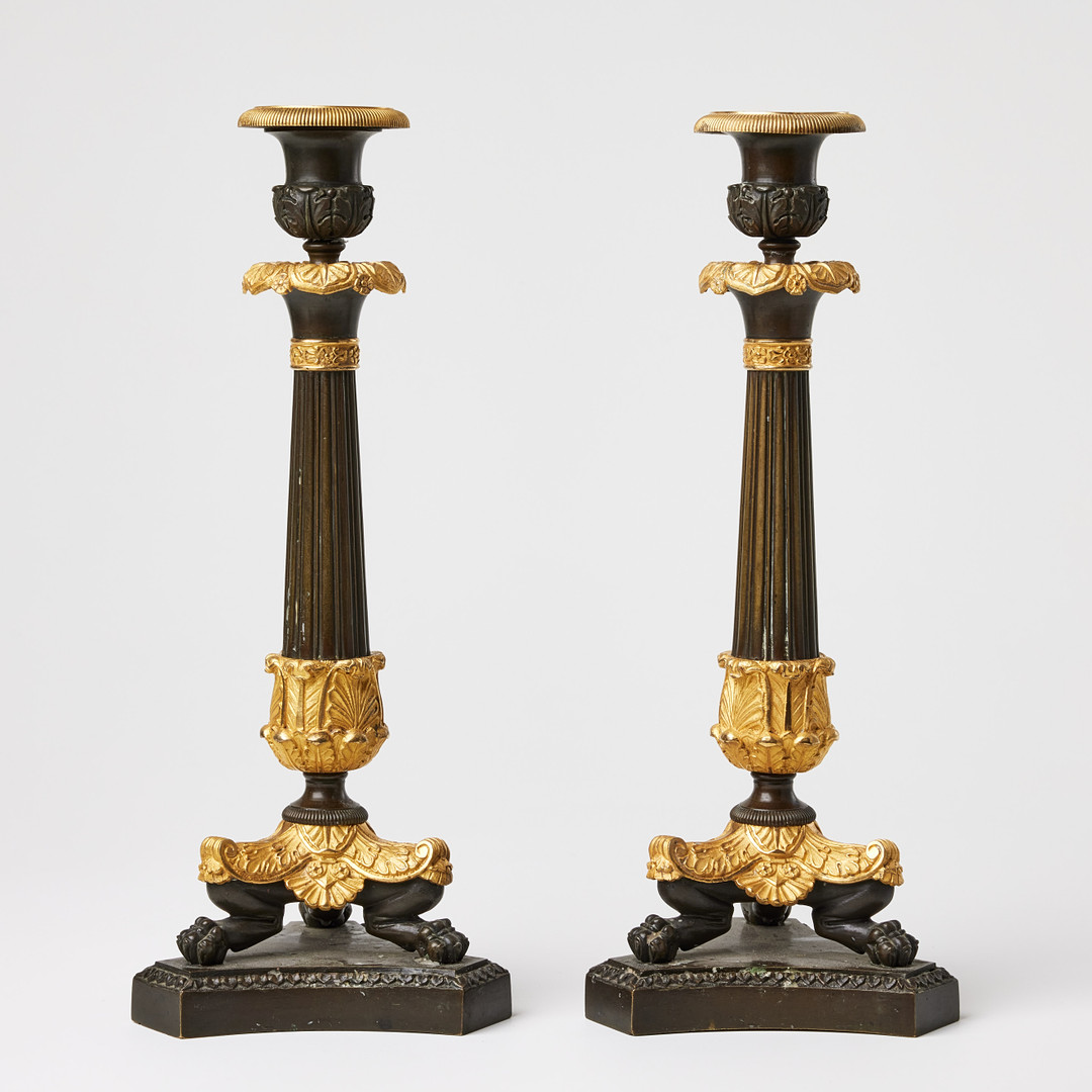 LJUSSTAKAR, ett par, Louis-Philippe, Frankrike 1800-talets andra kvartal, matterad och polerad brännförgyld och mörkpatinerad brons.