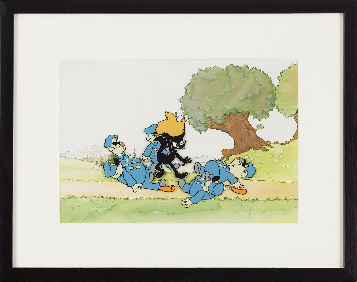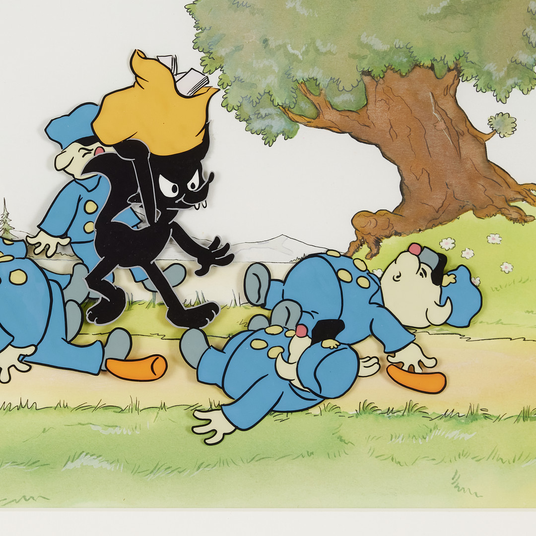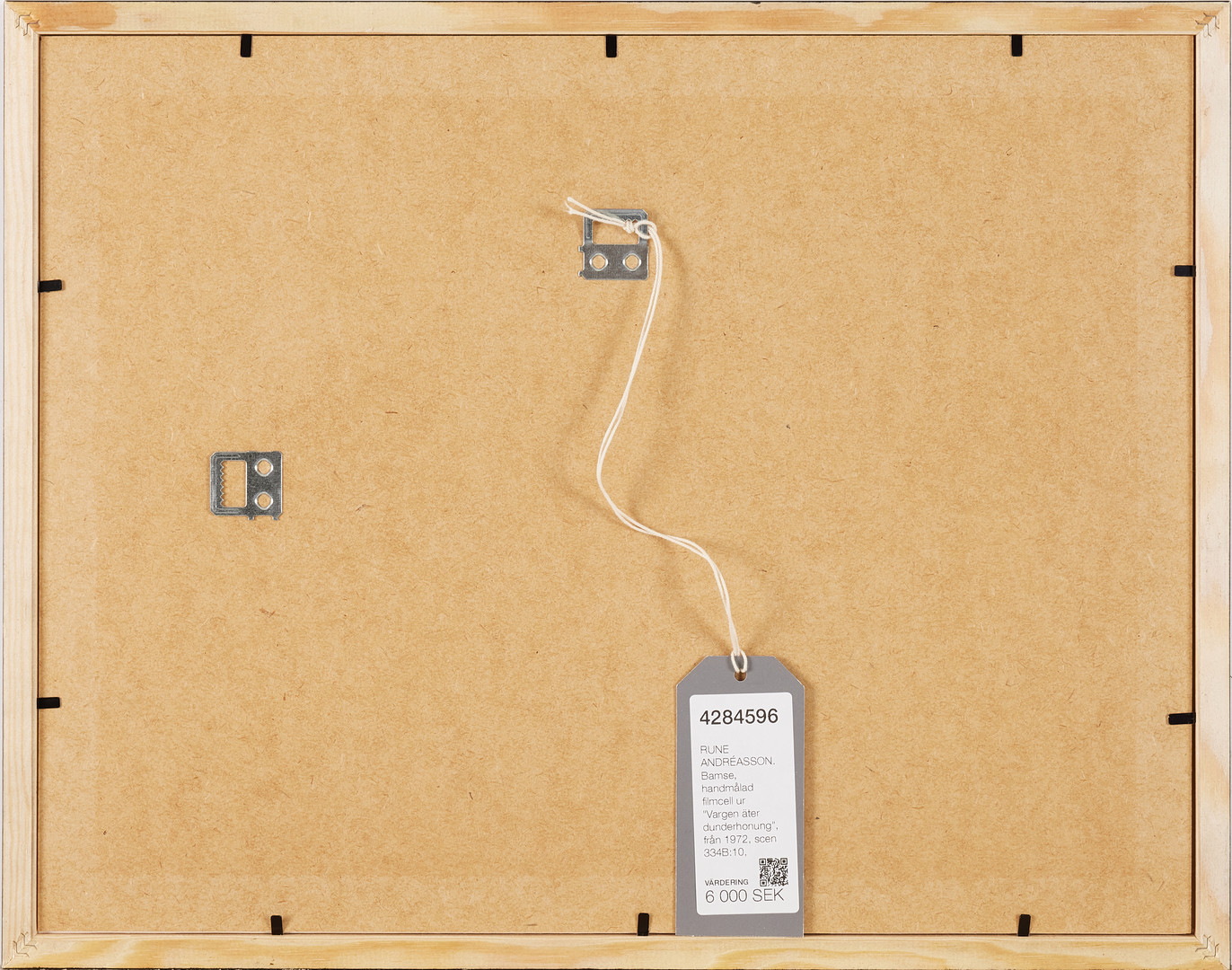 RUNE ANDRÉASSON. Bamse, handmålad filmcell ur "Vargen äter dunderhonung", från 1972, scen 334B:10, monterad på den handmålade originalbakgrunden.