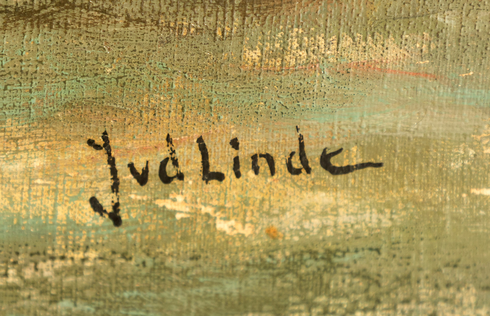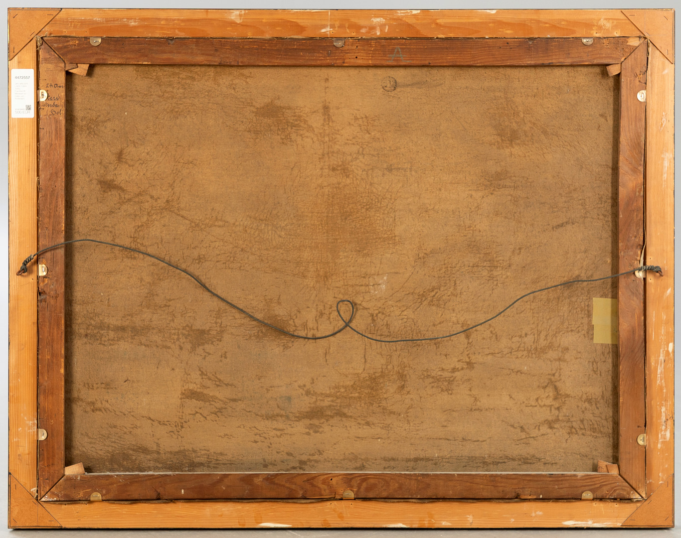 Leinwand schwach wellig. Mehrere kleine Farbabplatzungen, vorwiegend im unteren linken Bildbereich.