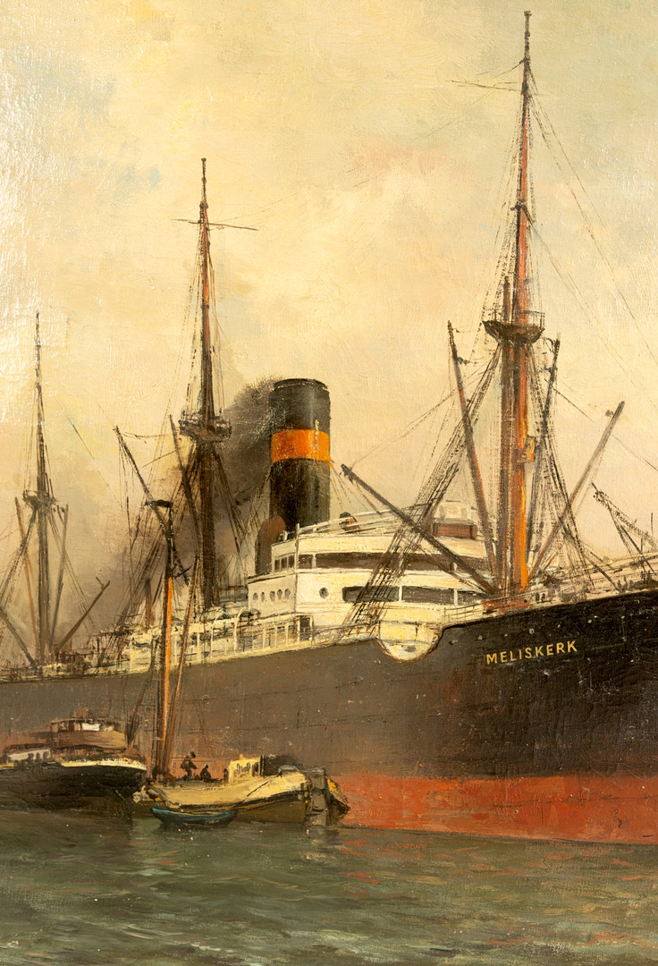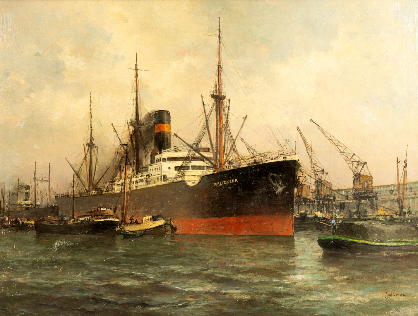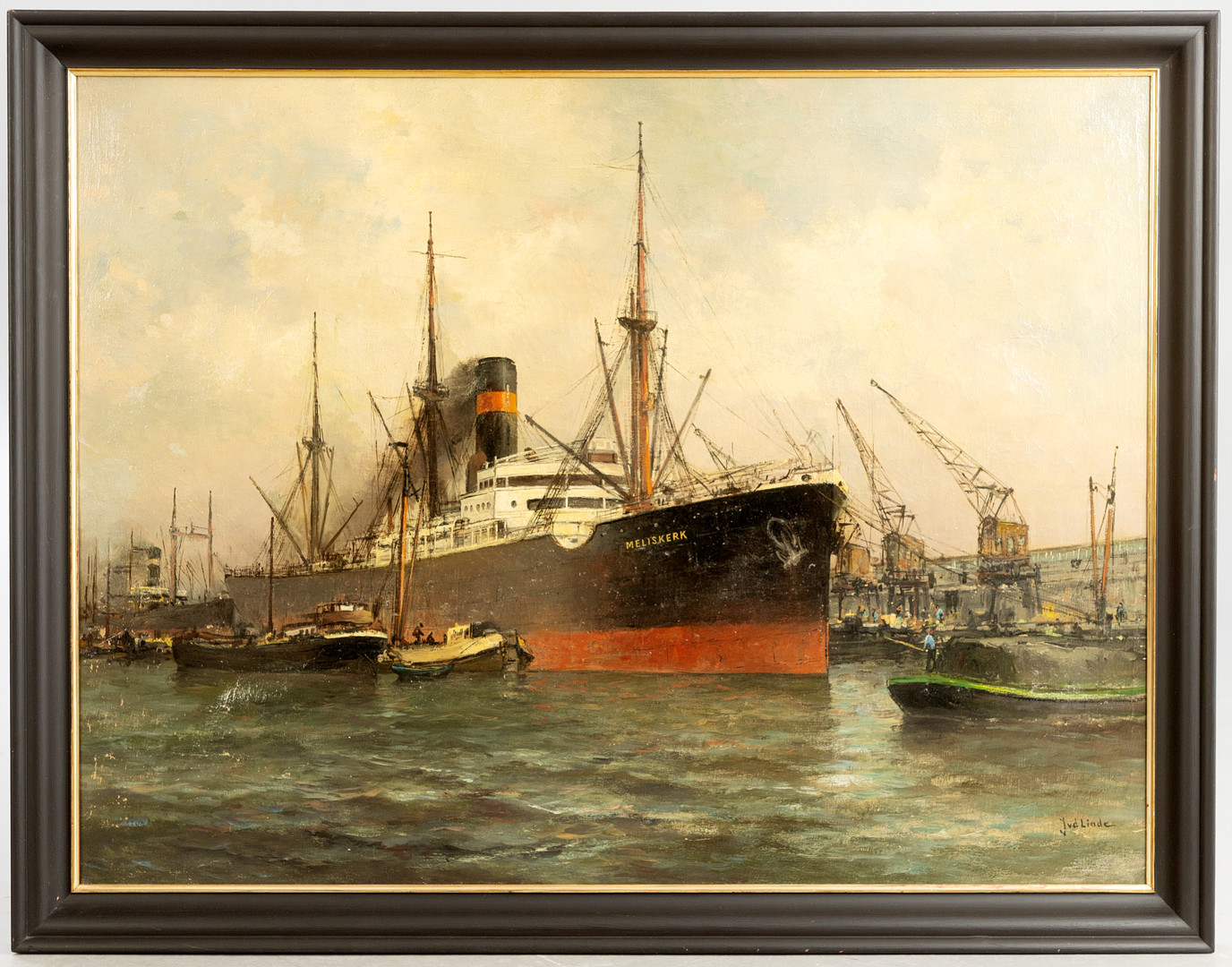 JAN VAN DER LINDE (1864-1945). Frachtschiff Meliskerk im Hafen von Rotterdam.