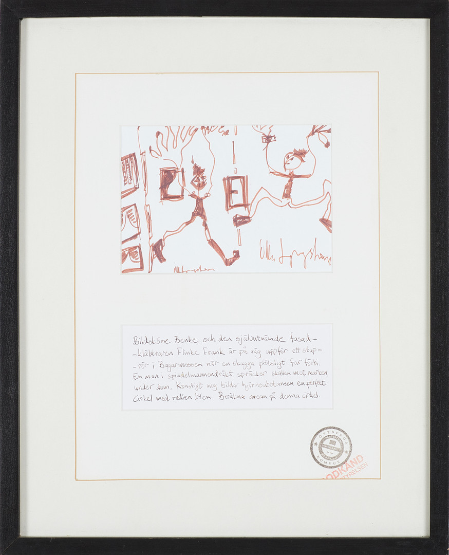 OLLE LJUNGSTRÖM. tuschteckning, "Bildsköne Benke...", illustration till ett matteproblem, Östberga Komvux, 2010-tal, möjligen bokillustration.
