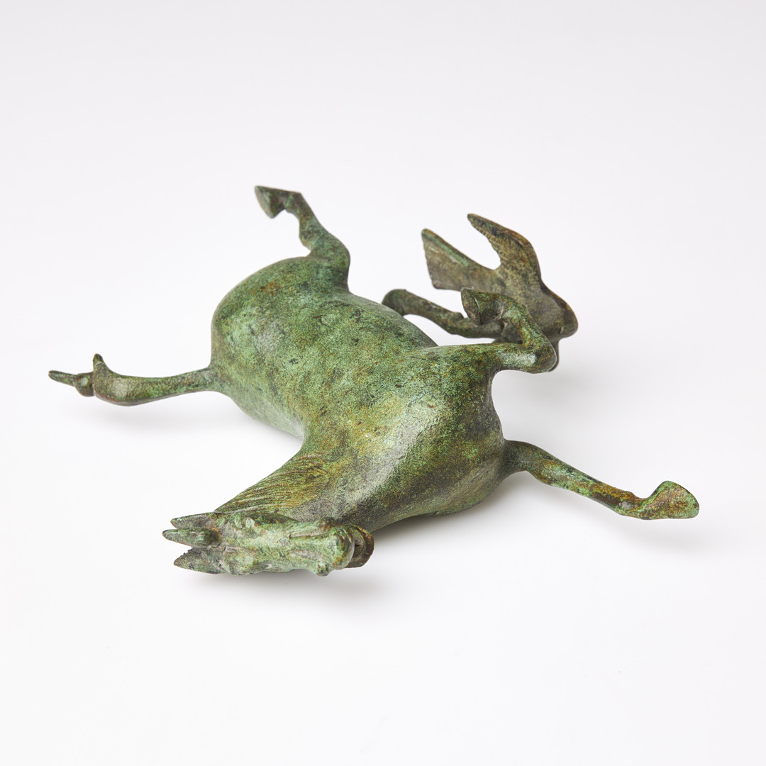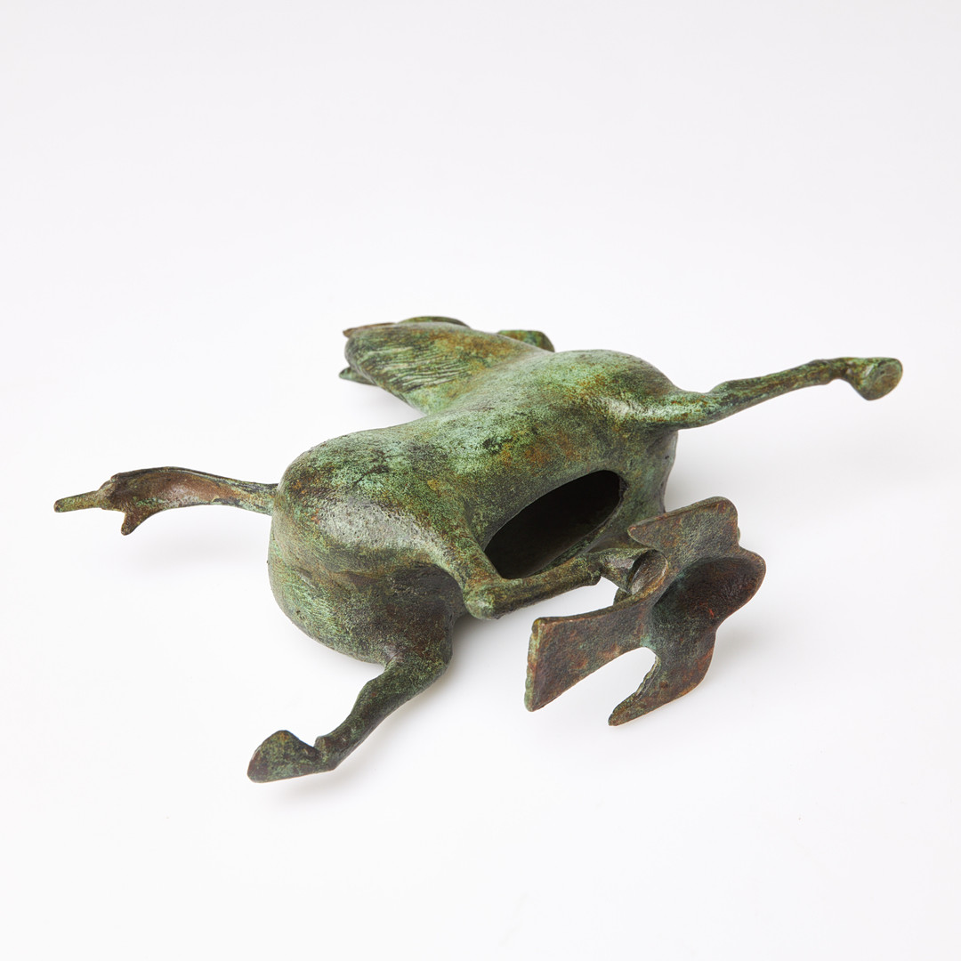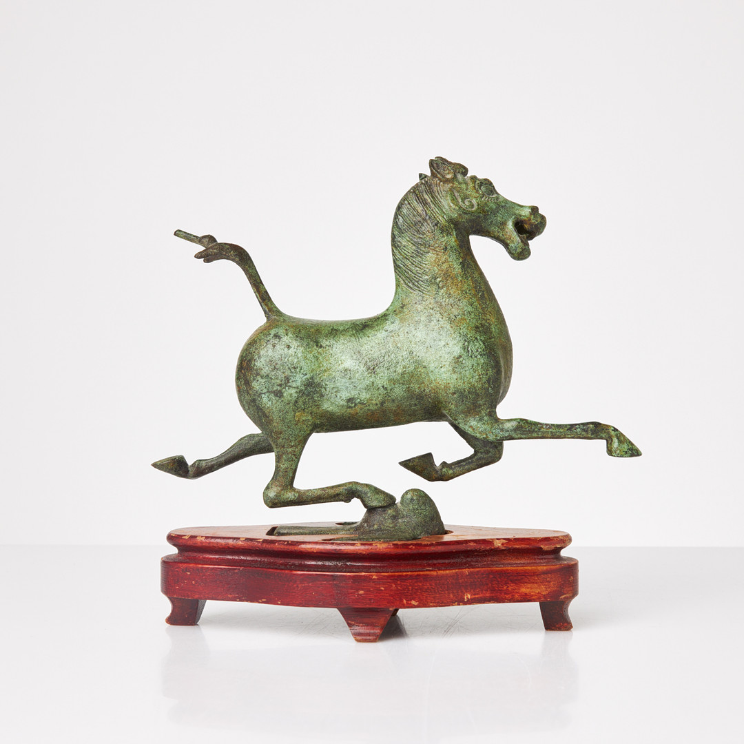 SKULPTUR, patinerad brons, efter "Den flygande hästen från Gansu", på träfot, Kina, 1900-tal.