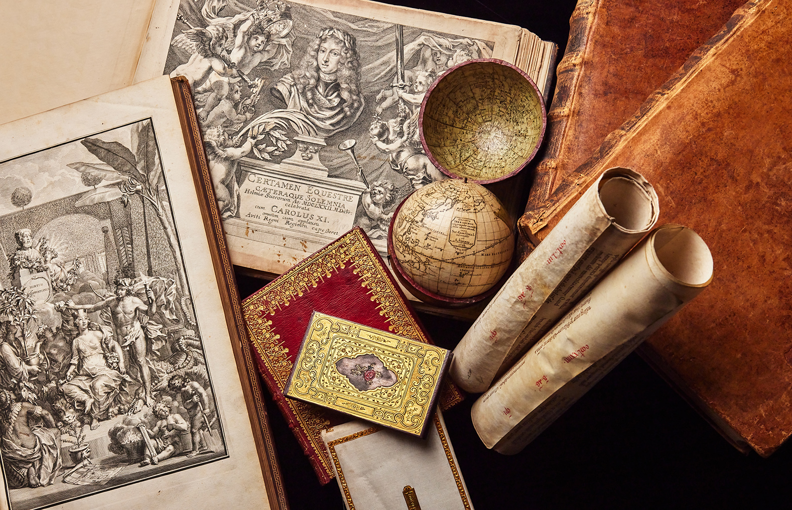 One of our highlights is a fine and very rare 11 cms pocket globe dated 1762 in its original sheep-skin case by the famous Swedish globemaker Anders Åkerman.