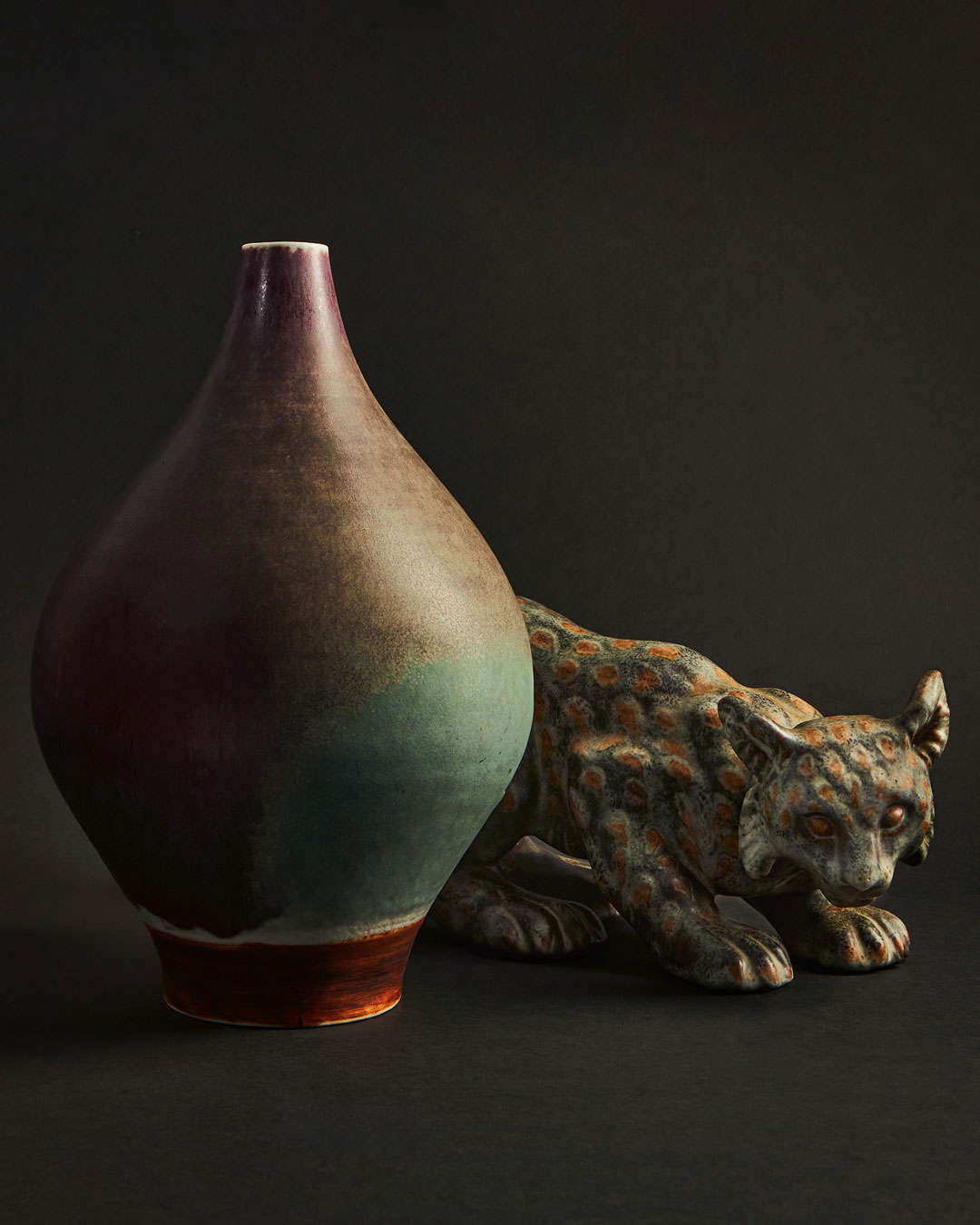 Åke Holm is represented by several pieces, as is Isak Isaksson, who accounts for a number of oxblood-coloured works. A plateau by Ilse Claesson embodies the cool elegance of Art Deco at its most distinctly Swedish. Beside it is displayed a small masterpiece of a vase by Anders Bruno Liljefors. And standing quite apart is a bowl by Hertha Hillfon — heavy and unabashed.