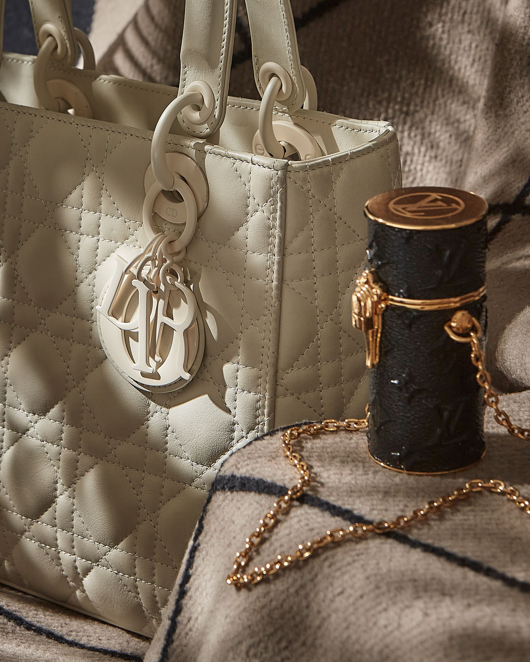 From Louis Vuitton comes a Dauphine Soft GM and a Neverfull MM Match Bleu. From the same house, a delightful steamer trunk is also on offer. Then there is the hat box from Gucci, monogrammed in leather.