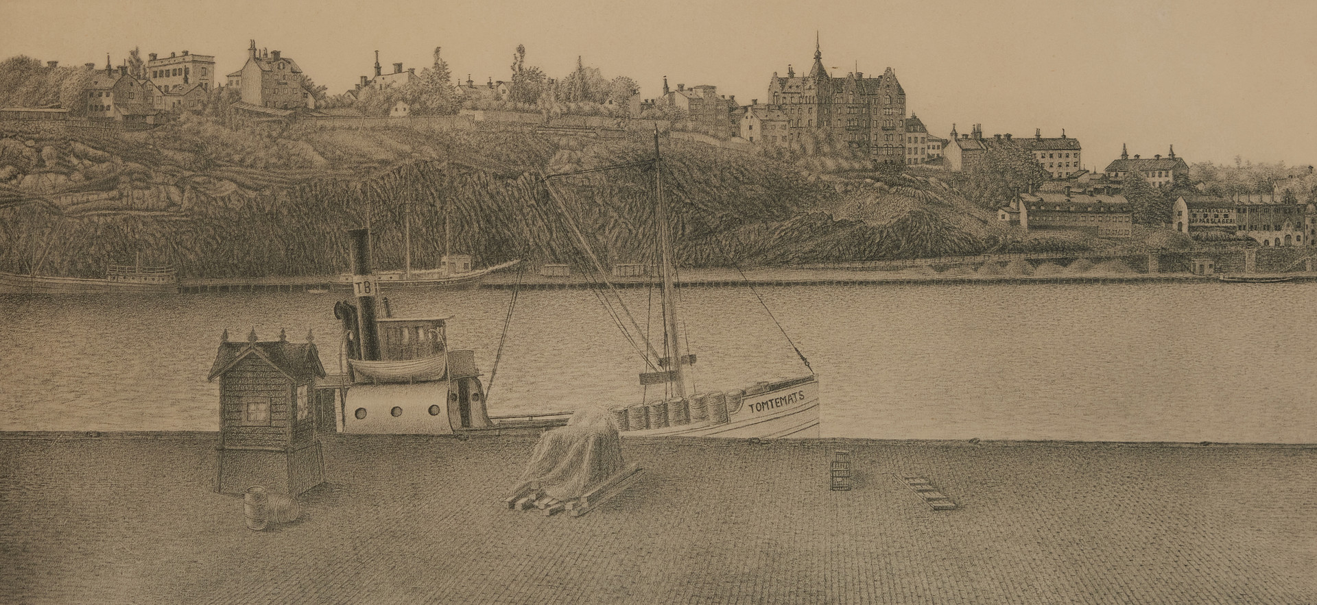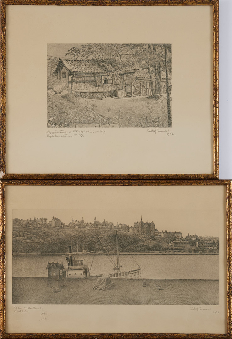 GUSTAF ISANDER (1863-1929) "Norr Mälarstrand Stockholm" och "Ryggåsstuga Tjärhovsgatan 35-37 Stockholm" litografier, 2 st., signerade och daterade Gustaf Isander 1924 och 1923.