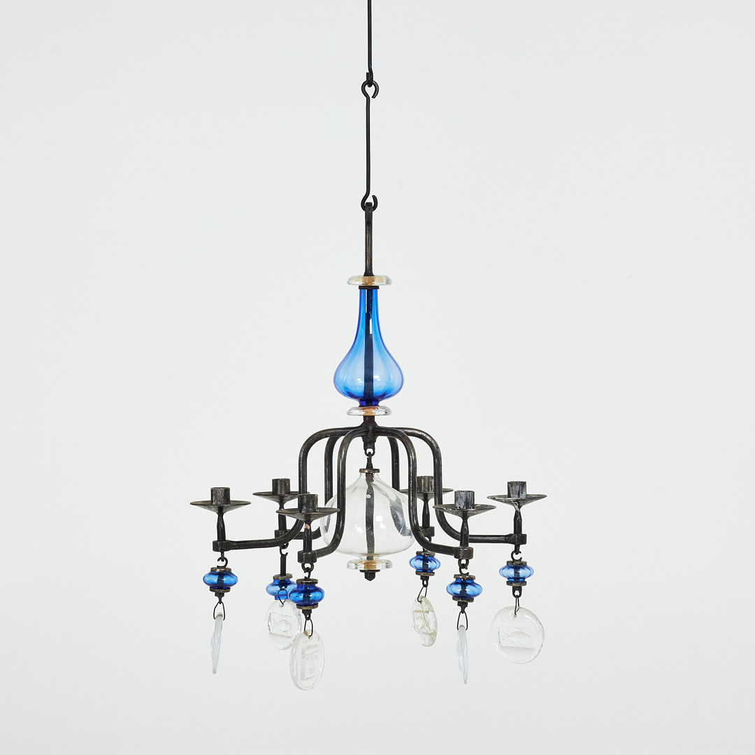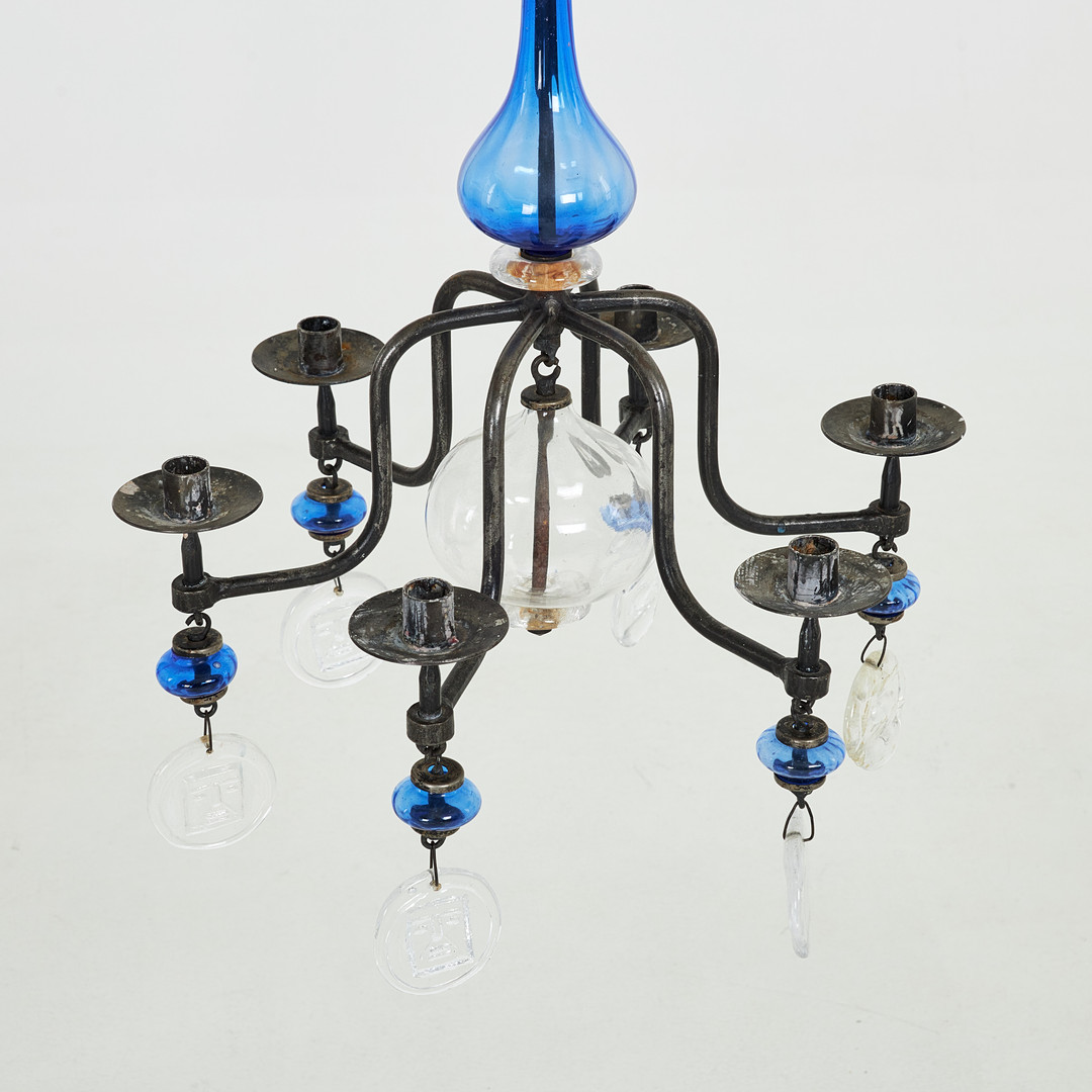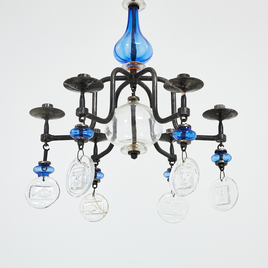 ERIK HÖGLUND. ljuskrona, Boda Glasbruk, smidesjärn, 6 ljusarmar, behängd med glasprismor med pressad dekor.