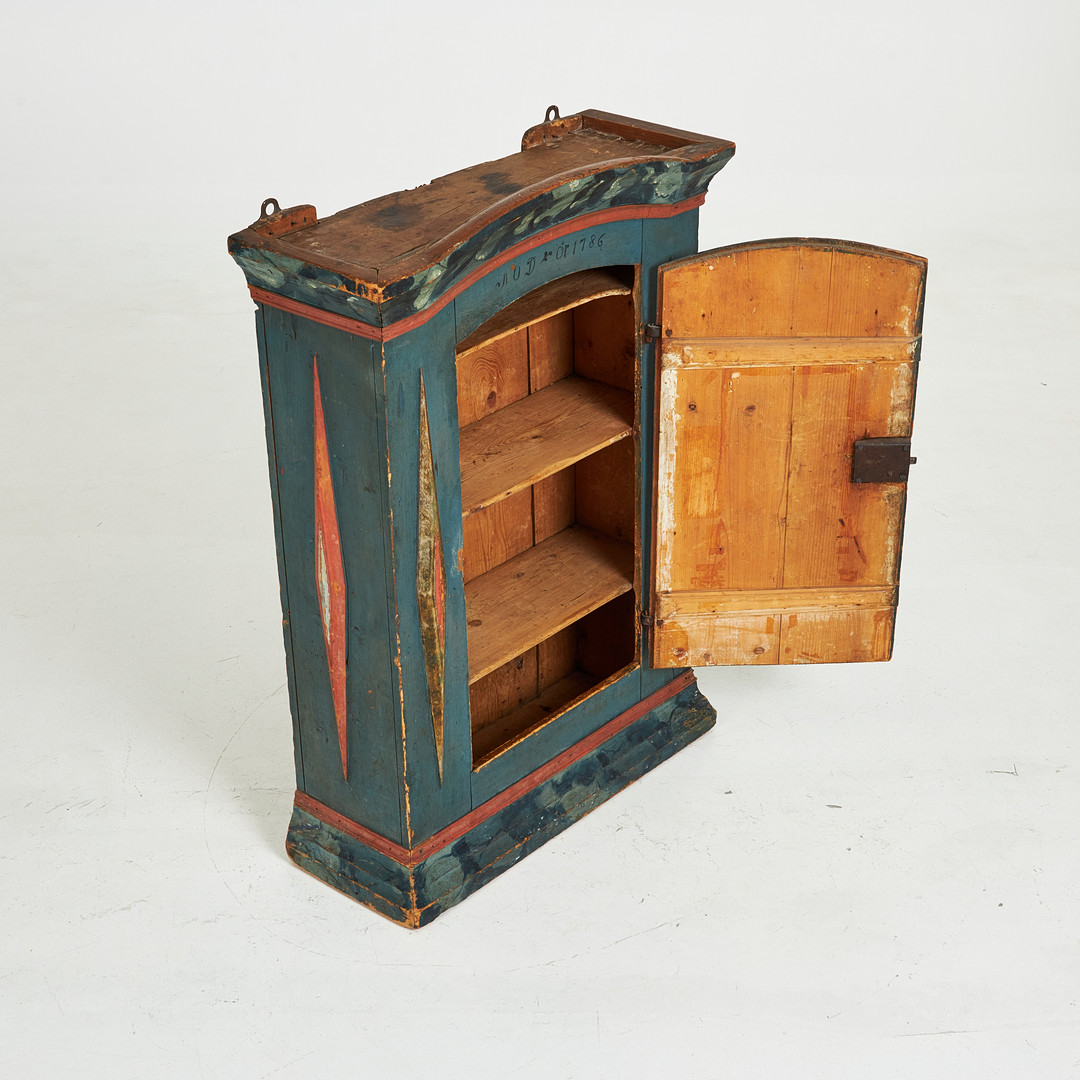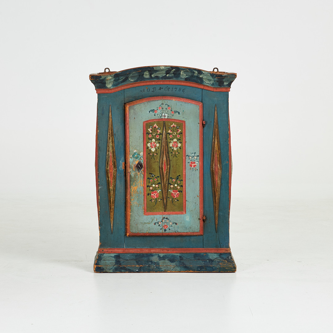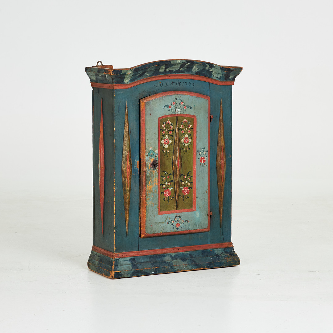 VÄGGSKÅP. Allmoge, 1700-tal, bär året 1786, polykromt bemålad dekor.