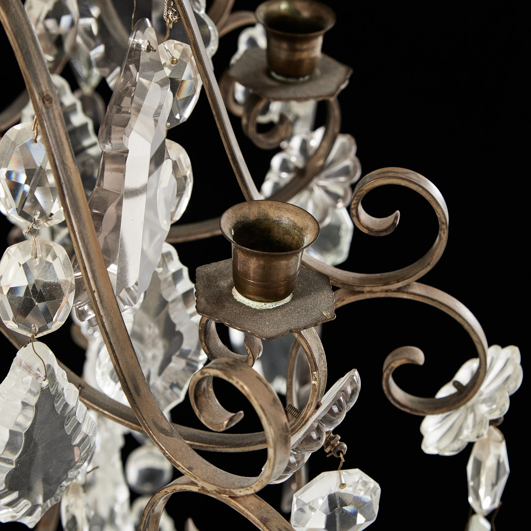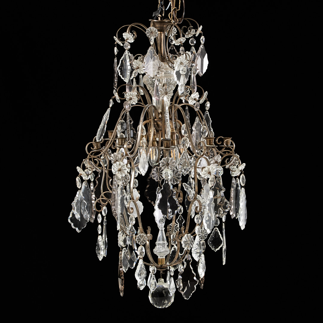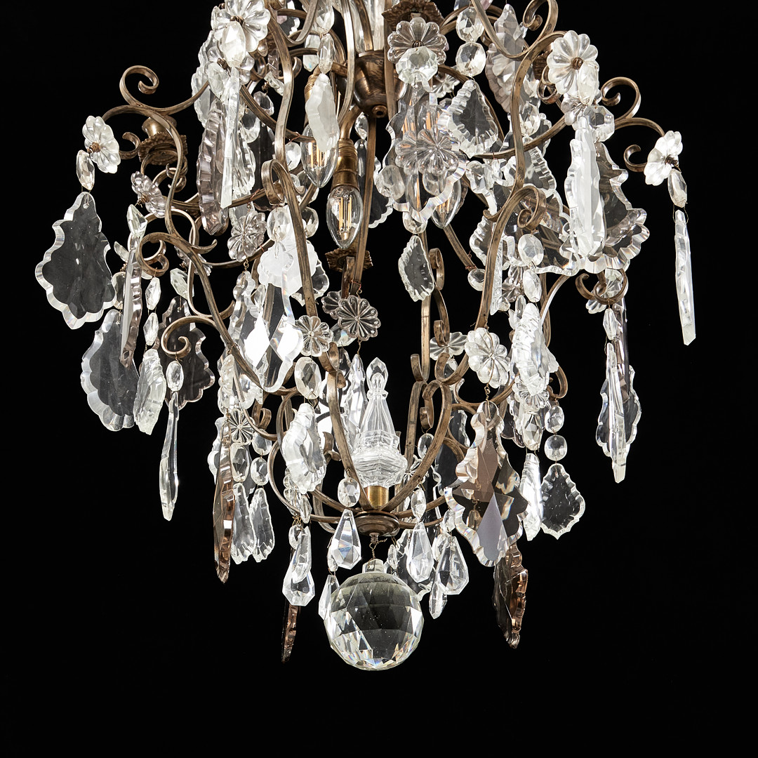 LJUSKRONA, 1900-talets första hälft, rokokostil, stomme i patinerad mässing, behängd med olikformade prismor, delvist rökfärgade.