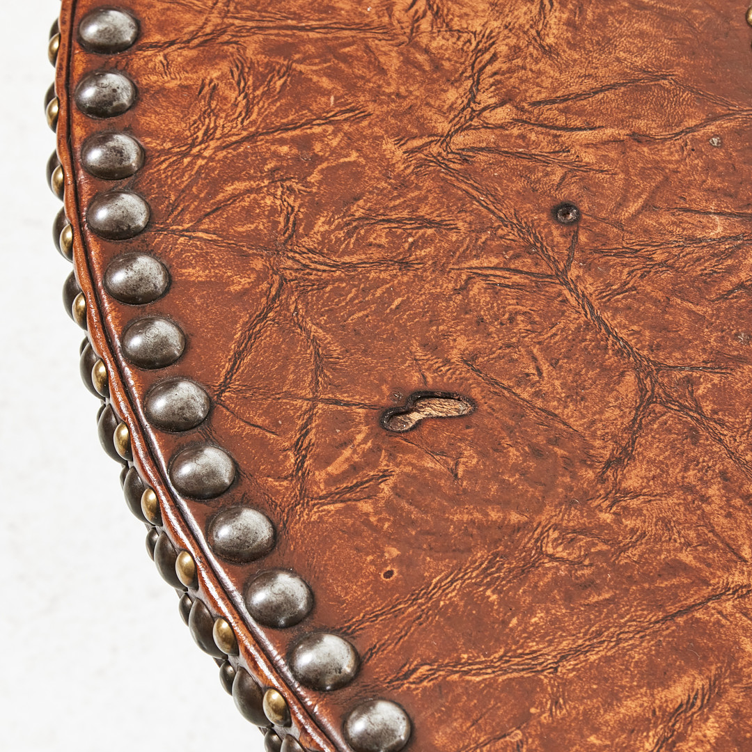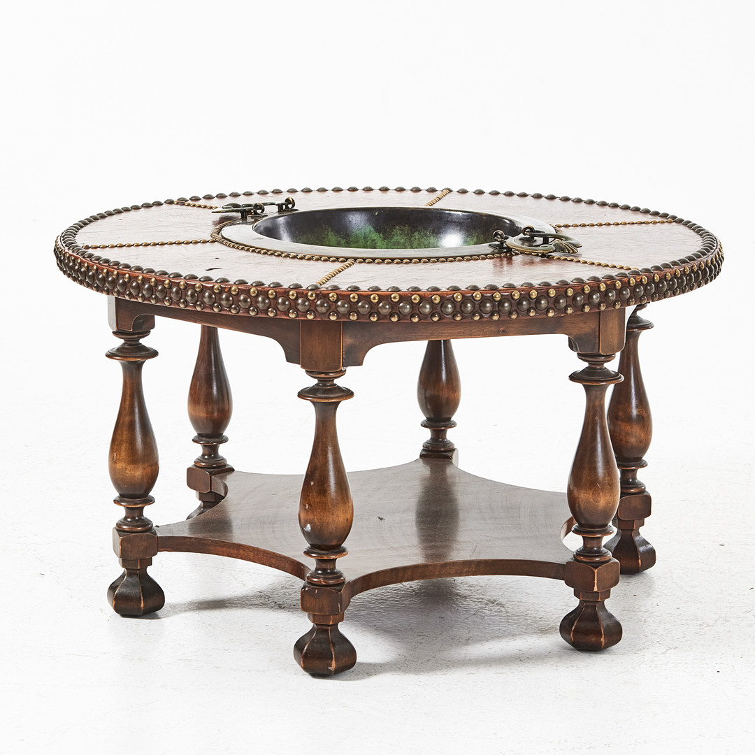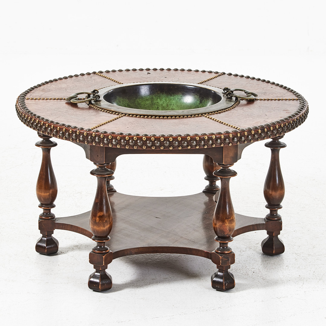 BORD, Lysberg & Hansen, Köpenhamn, 1900-talets första hälft, underrede av mörkbetsad bok, svarvade ben. Läderklädd skiva med dekorativ pärlspik. Insats av grönpatinerad metall med två hänklar.