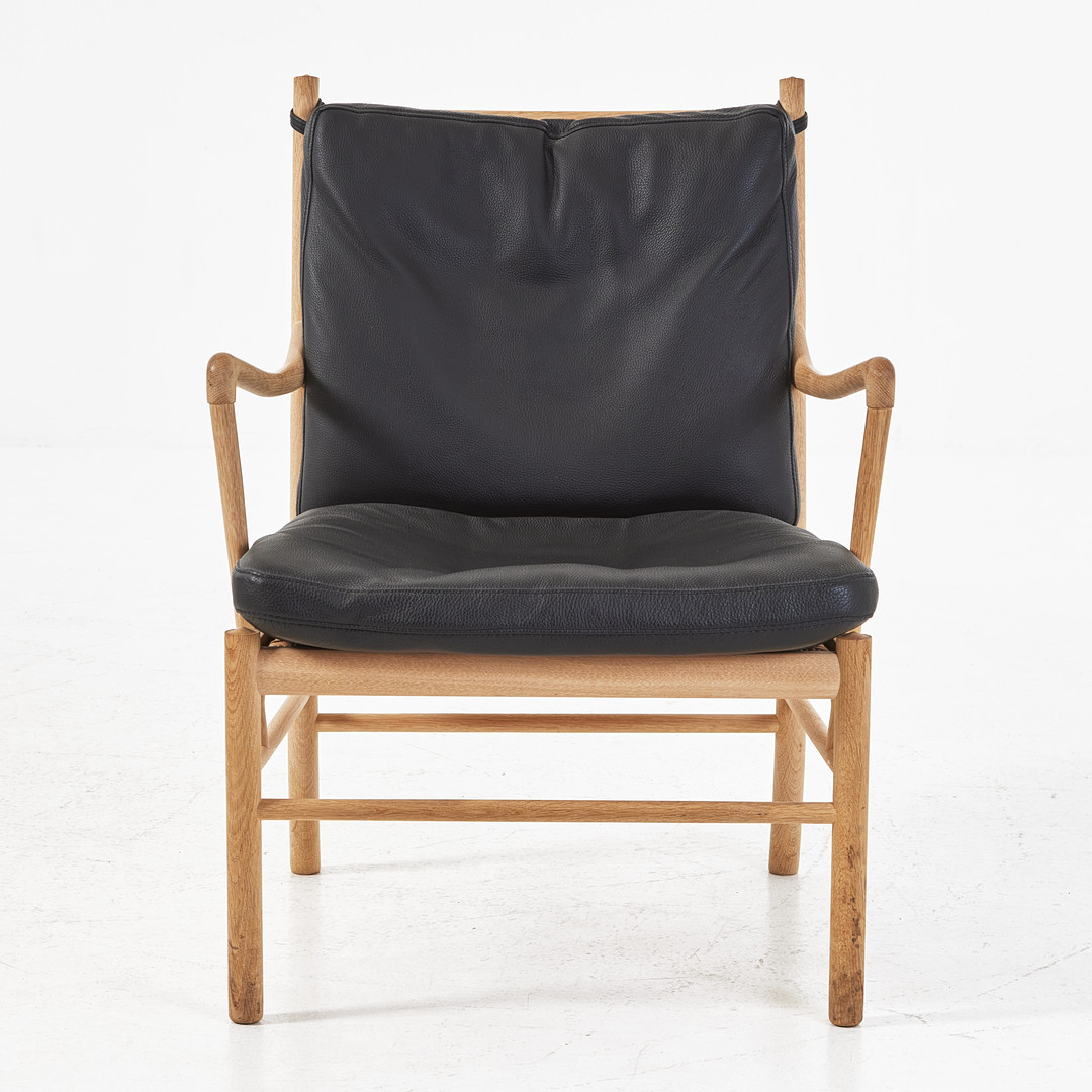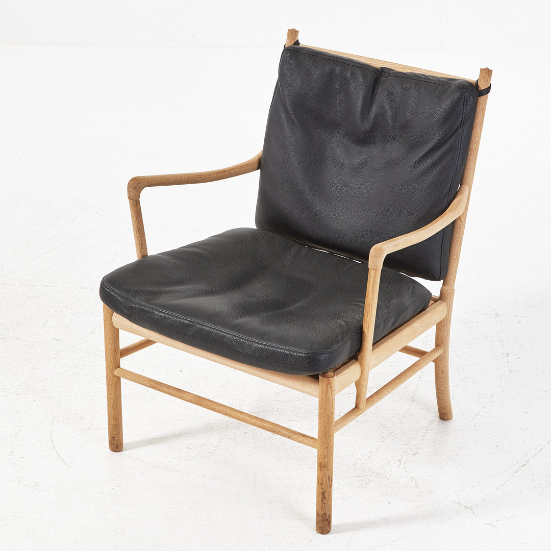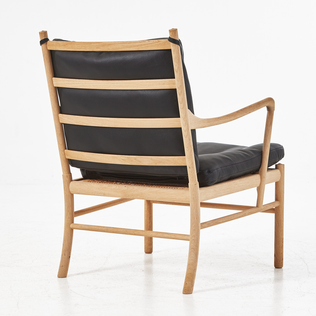OLE WANSCHER. Armlänstol "Colonial chair" för Carl Hansen & Søn. Ek med sits av flätad rotting, läderklädda dynor. Etikettmärkt.