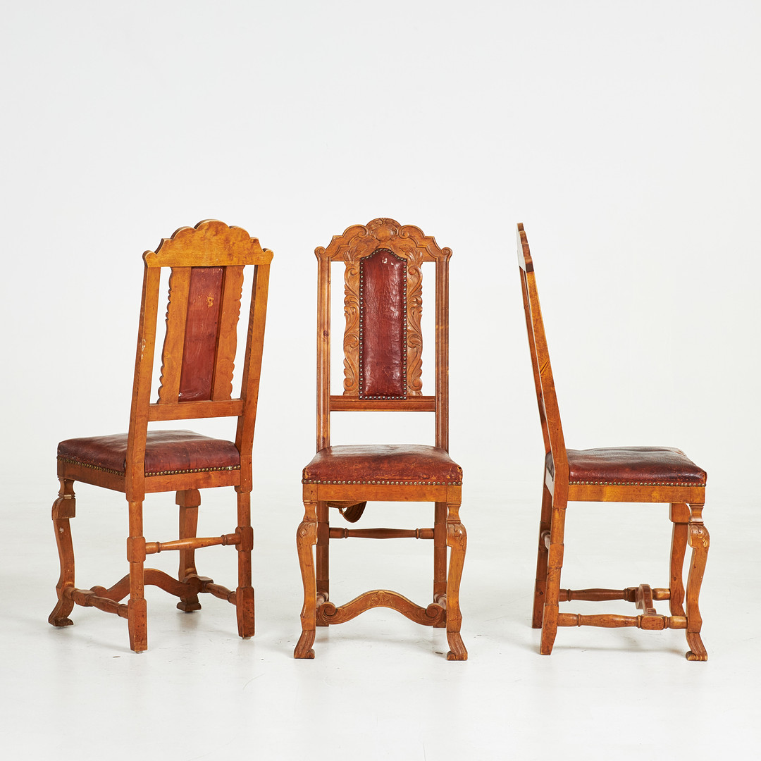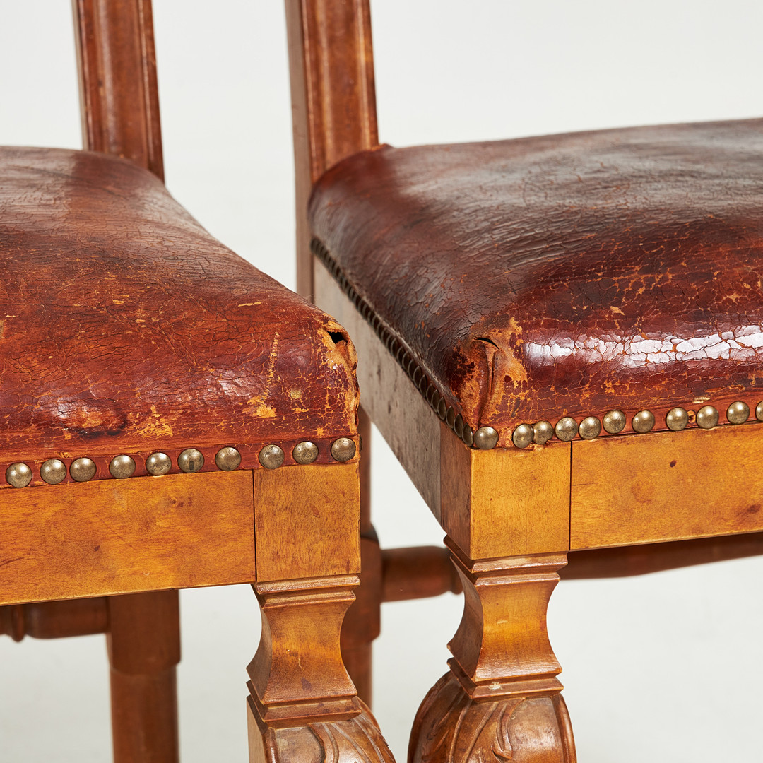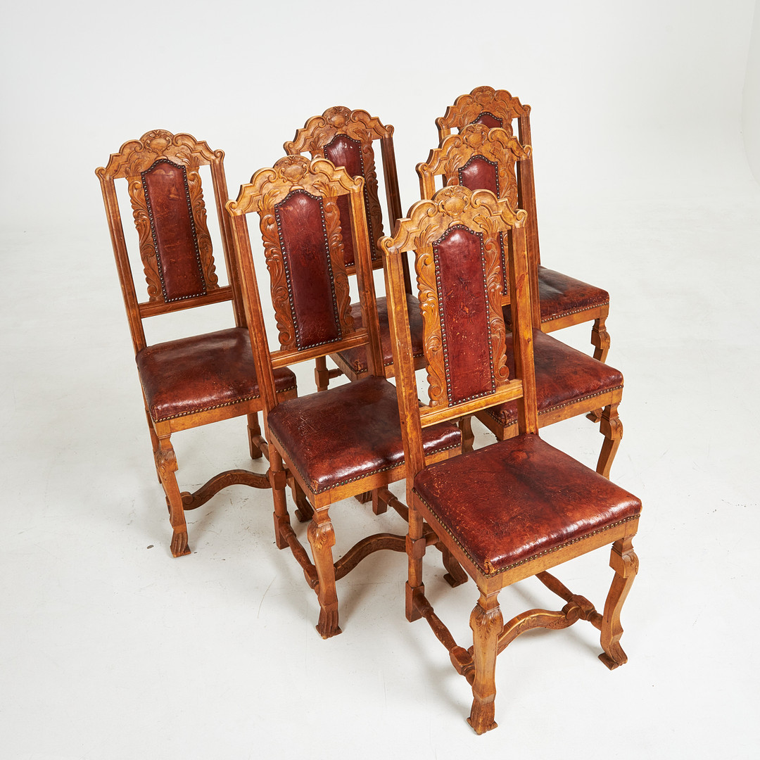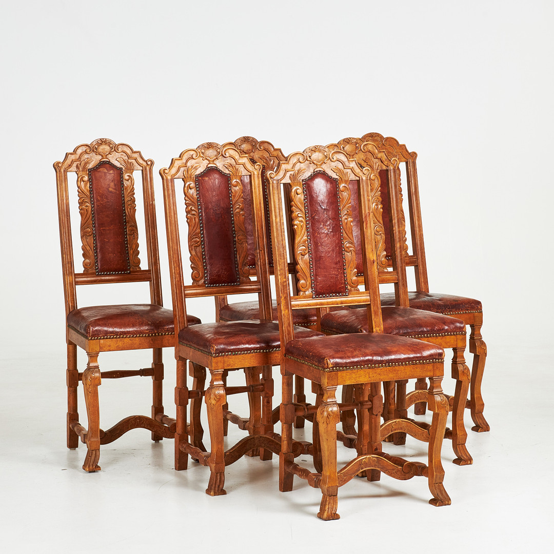 STOLAR, 6 st, barockstil, skuren dekor, klädsel i nithäftat läder, undertill med sadelgjord, 1900-talets början.