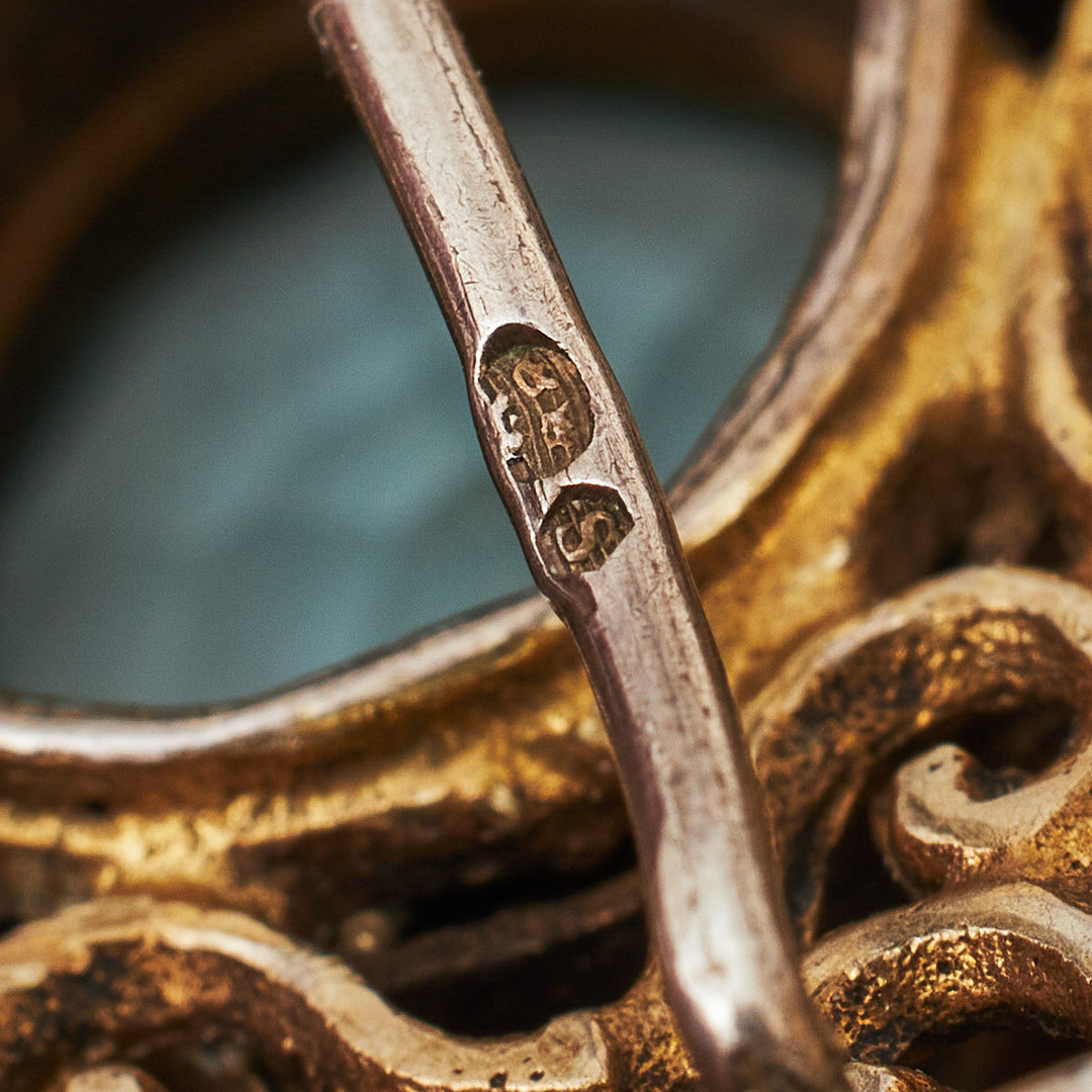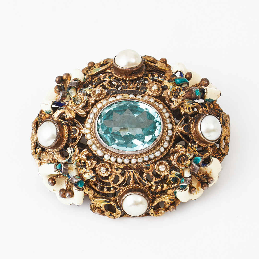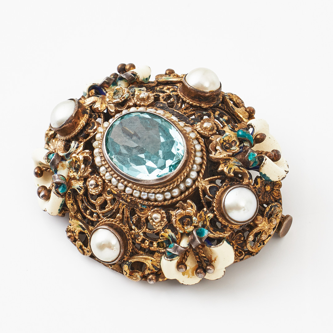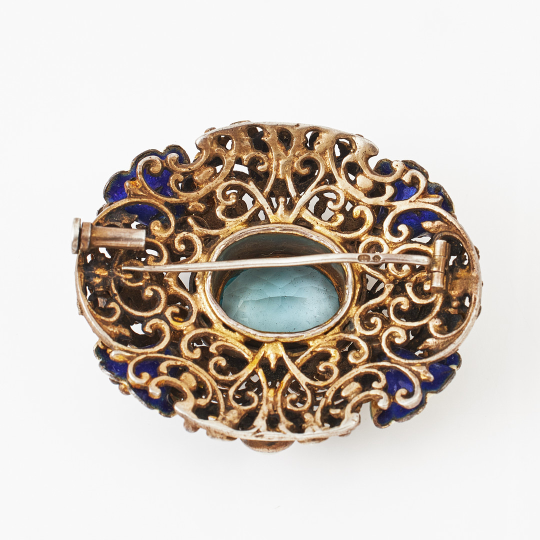 BROSCH, förgyllt silver, blomformade dekordelar med emaljdekor, oval fasettslipad syntetisk blå sten bekransad av små orientpärlor uppträdda på metallvajer, Österrike/Ungern omkring 1900, svenska importstämplar.