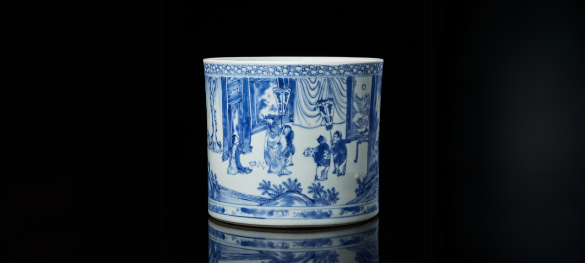 As well as a rare blue and white brushpot, “Bitong”, with Kangxi mark and of the period 1662–1722. The pot exterior is skilfully painted with a continuous scene depicting a standing dignitary and a seated lady on a terrace, accompanied by young attendants holding fans – all within a landscape of trees, rockwork, and scudding clouds. The brush pot measures 15 cm in height and 17,3 cm in diameter.