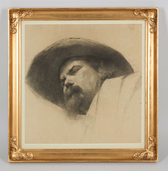 Helene Schjerfbeck aloitti Pariisin-opiskelunsa marraskuussa 1880 madame Trélat de Vignyn naisten akatemiassa. Hänen ystävänsä ja kollegansa Helena Westermarck oli jo työskennellyt siellä edellisenä lukukautena. Schjerfbeck ja Westermarck siirtyivät kuitenkin jo seuraavana vuonna tammikuussa Académie Colarossiin. Tämä näyttävä hiilipiirustus on selvästi signeerattu vuodelle 1880, joten opiskelupaikkana on täytynyt olla tämän oikuttelevan rouva Trélat de Vignyn ateljee. Samat mallit saattoivat toimia monessa ateljeessa samanaikaisesti kuten myös vierailevat opettajataiteilijat. Schjerfbeck on valinnut vaativan alhaaltapäin katsovan kuvakulman parrakkaaseen malliinsa. Leveälierinen hattu muodostaa kokoavan elementin piirustukseen. Tiukkakatseinen mies on kuvattu uskottavasti ja hatun muoto ja herkästi hahmoteltu lieri auttavat mallin katseen suuntaamista eteenpäin. Schjerfbeck oli pienestä pitäen erittäin taitava luomaan hiilipiirustuksiinsa vahvan tunnelman ja tavoittamaan mallin karaktäärin niin kuin tässäkin hiilipiirustuksessa.