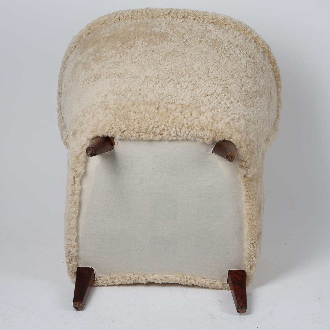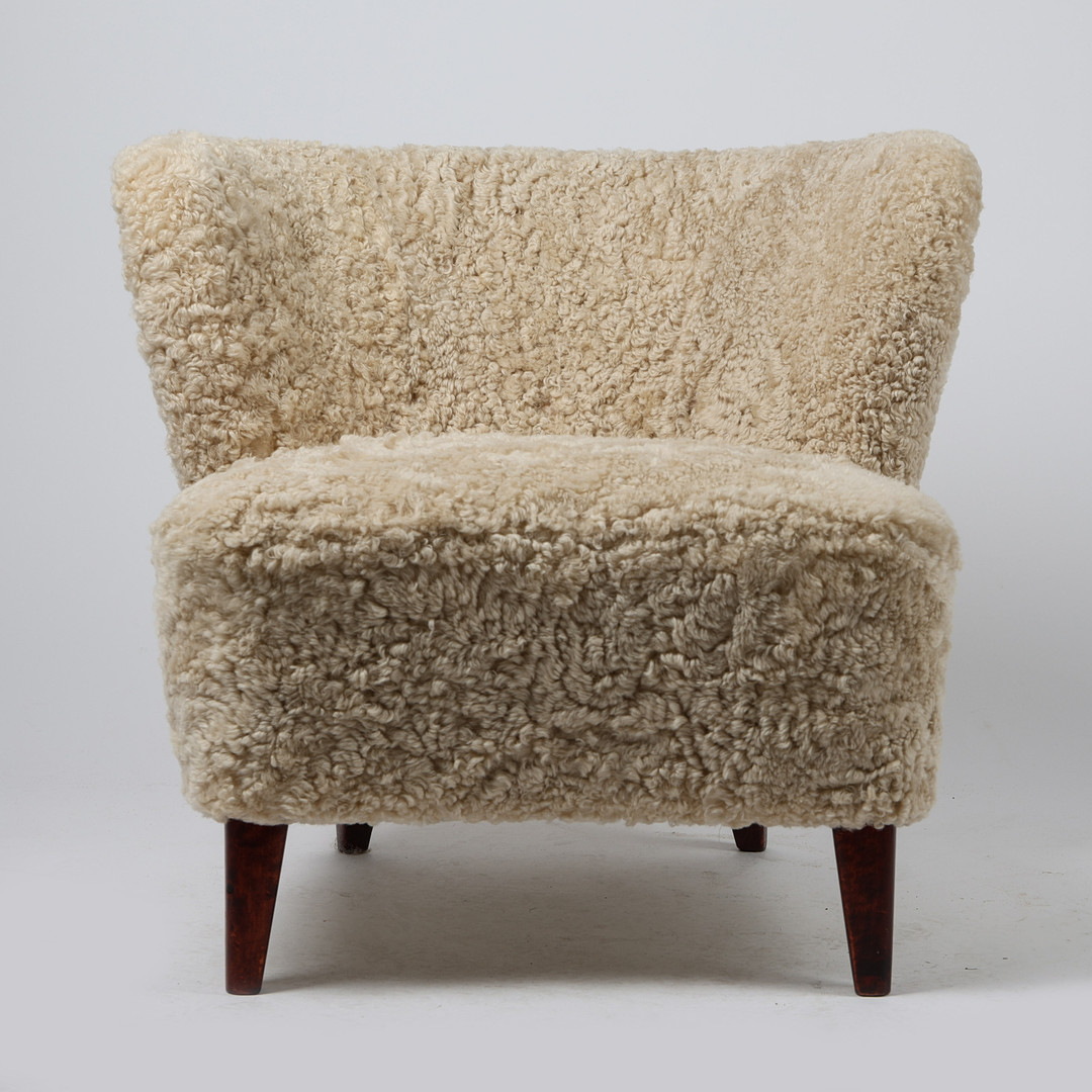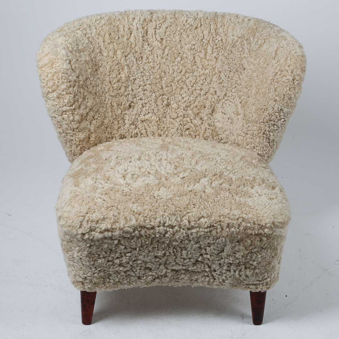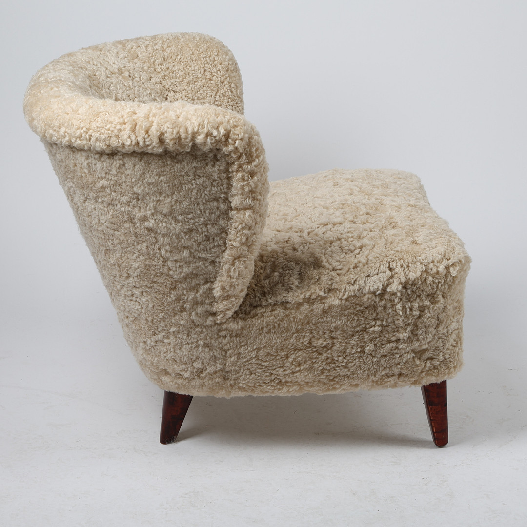 GÖSTA JONSSON. Fåtölj, Swedish modern, 1940-tal, klädd i fårskinnspäls Moonlight.
