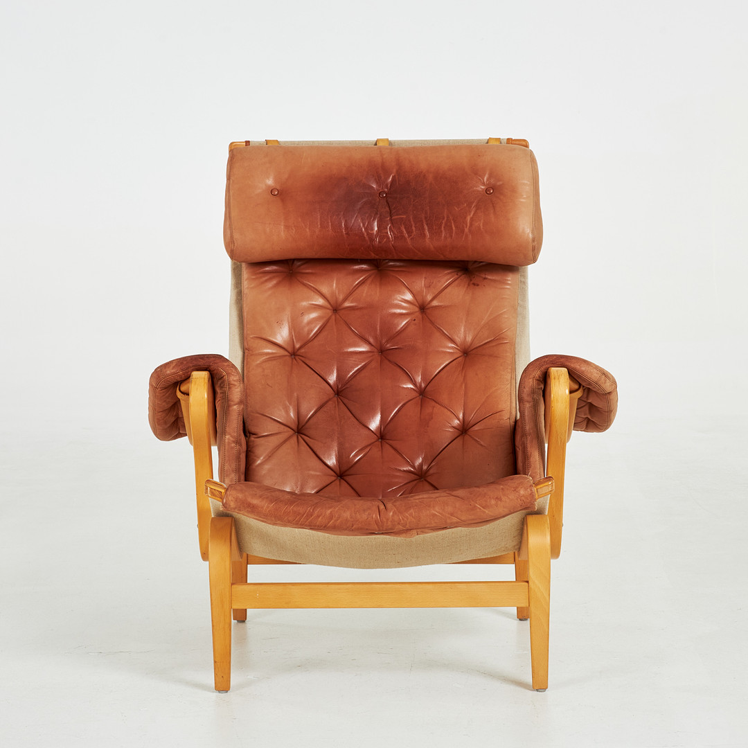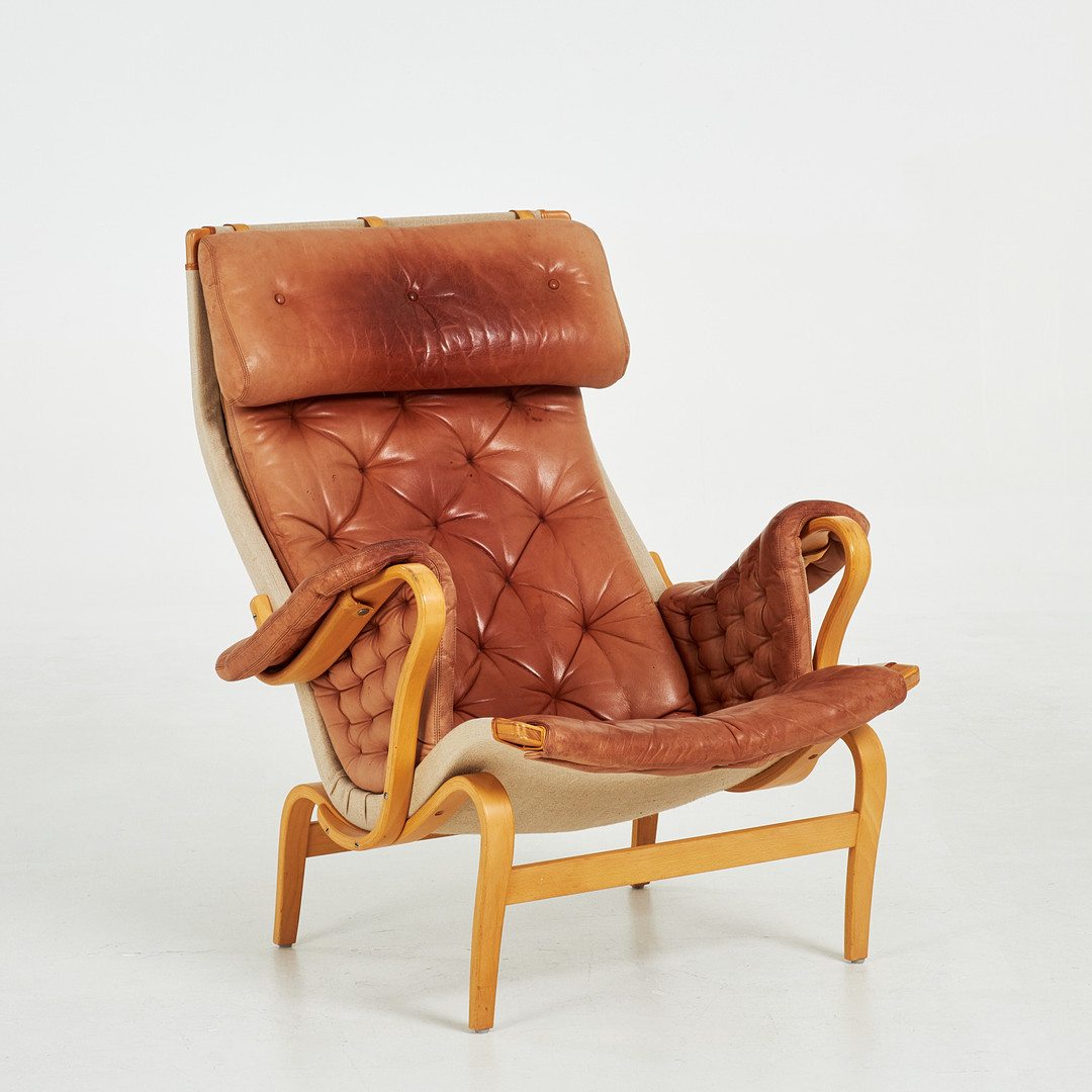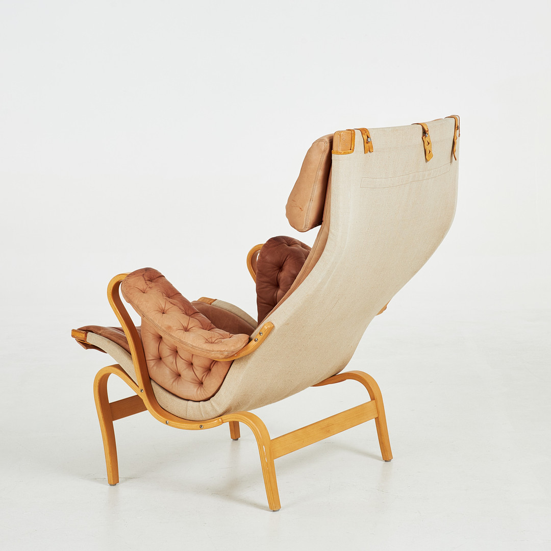 BRUNO MATHSSON. "Pernilla 69" fåtölj, stomme i bok, klädsel i canvas och läder, märkt DUX.