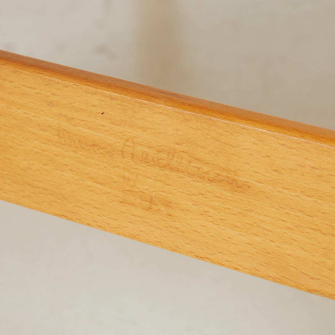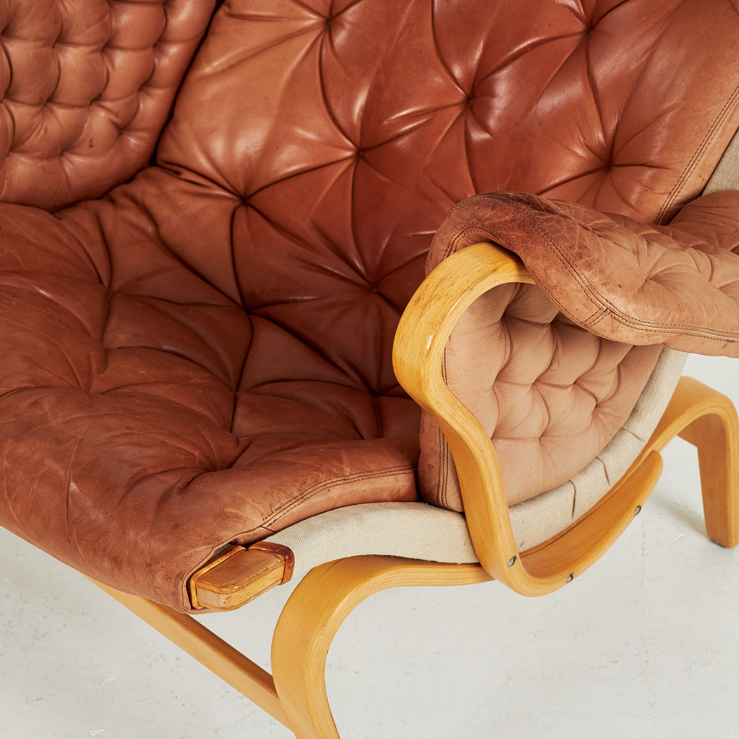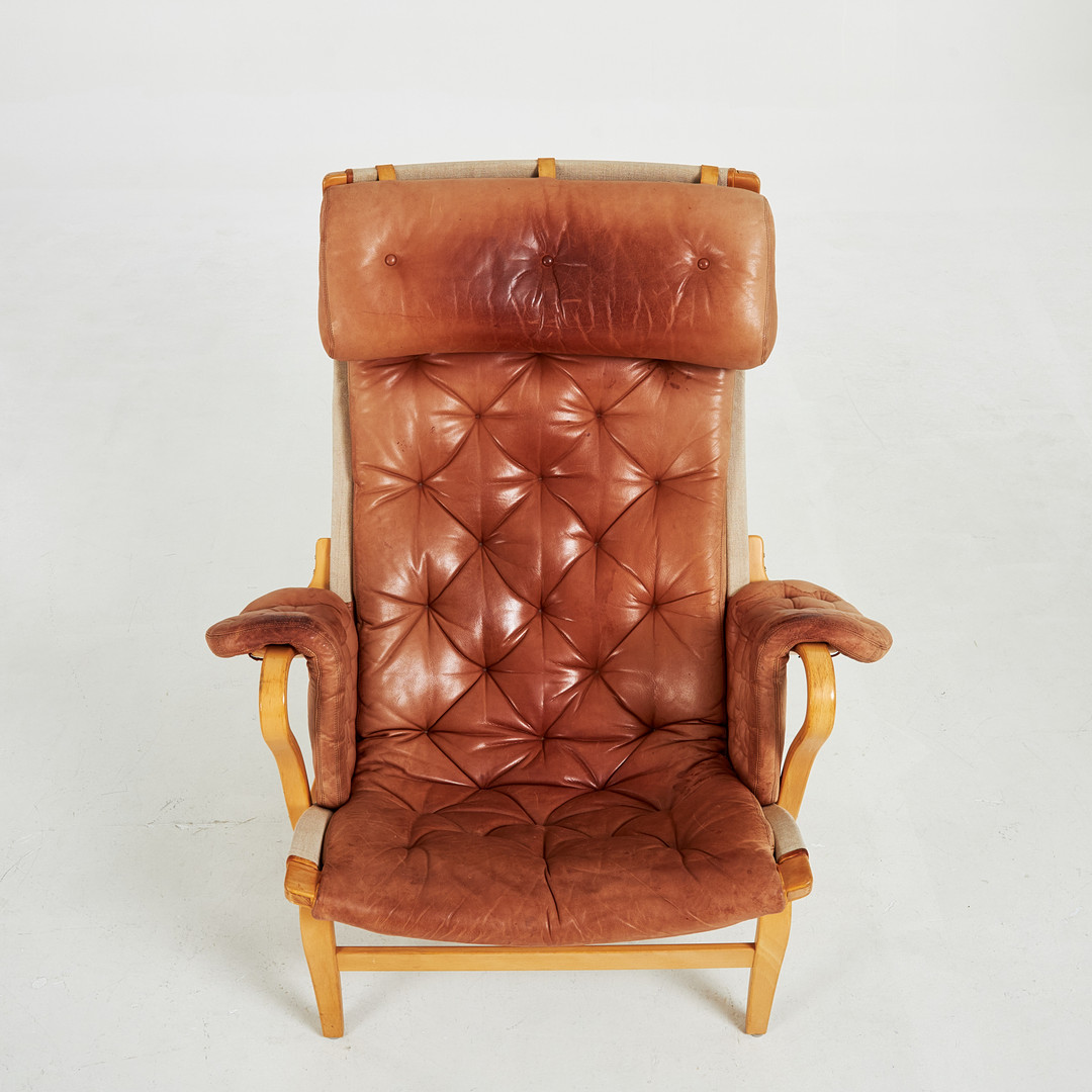 BRUNO MATHSSON. "Pernilla 69" fåtölj, stomme i bok, klädsel i canvas och läder, märkt DUX.