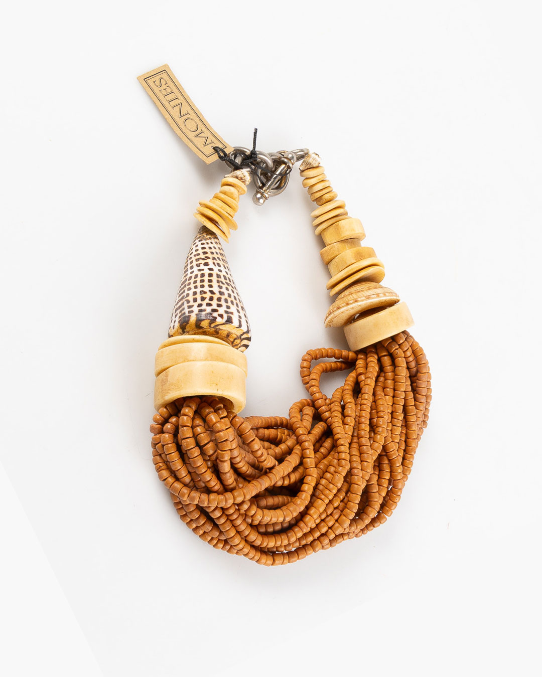 Att bära ett smycke av Gerda Lynggaard är ett statement. Här är det inte tal om någon blygsam skandinavism med minimala förtecken. Tvärtom. Här får vi de där formerna som Monies Copenhagen gjort sig kända för. Robusta, organiska skapelser. Naturmaterial som pärlor, musslor, läder, horn, bärnsten och kvarts.