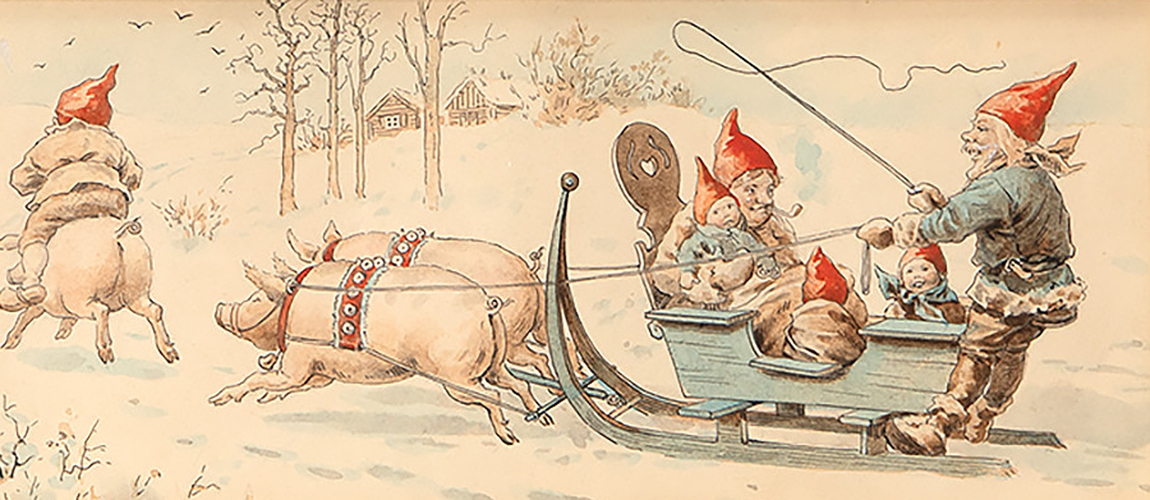 Men det är långt ifrån allt. Under det sena 1800-talet tillhörde hon den progressiva skara konstnärer som försökte reformera de inhemska institutionella ramverken för bildkonstnärer och skulptörer.Sin utbildning fick hon huvudsakligen vid Konstakademien. Tack vare ett stipendium fortbildade hon sig därefter i Paris där hon 1884 ställde ut på den årliga Salon de Paris. Året därpå anslöt hon sig till de progressiva Opponenterna. Parallellt med detta började hon göra sig ett namn som illustratör.Och det är främst som sådan vi nu möter henne hos Stockholms Auktionsverk Göteborg. I ett väl sammanhållet koncentrat får vi ta del av hennes vintervärld där två förlagor till omslag till Guldslottet utgör de förmodade toppnumren.