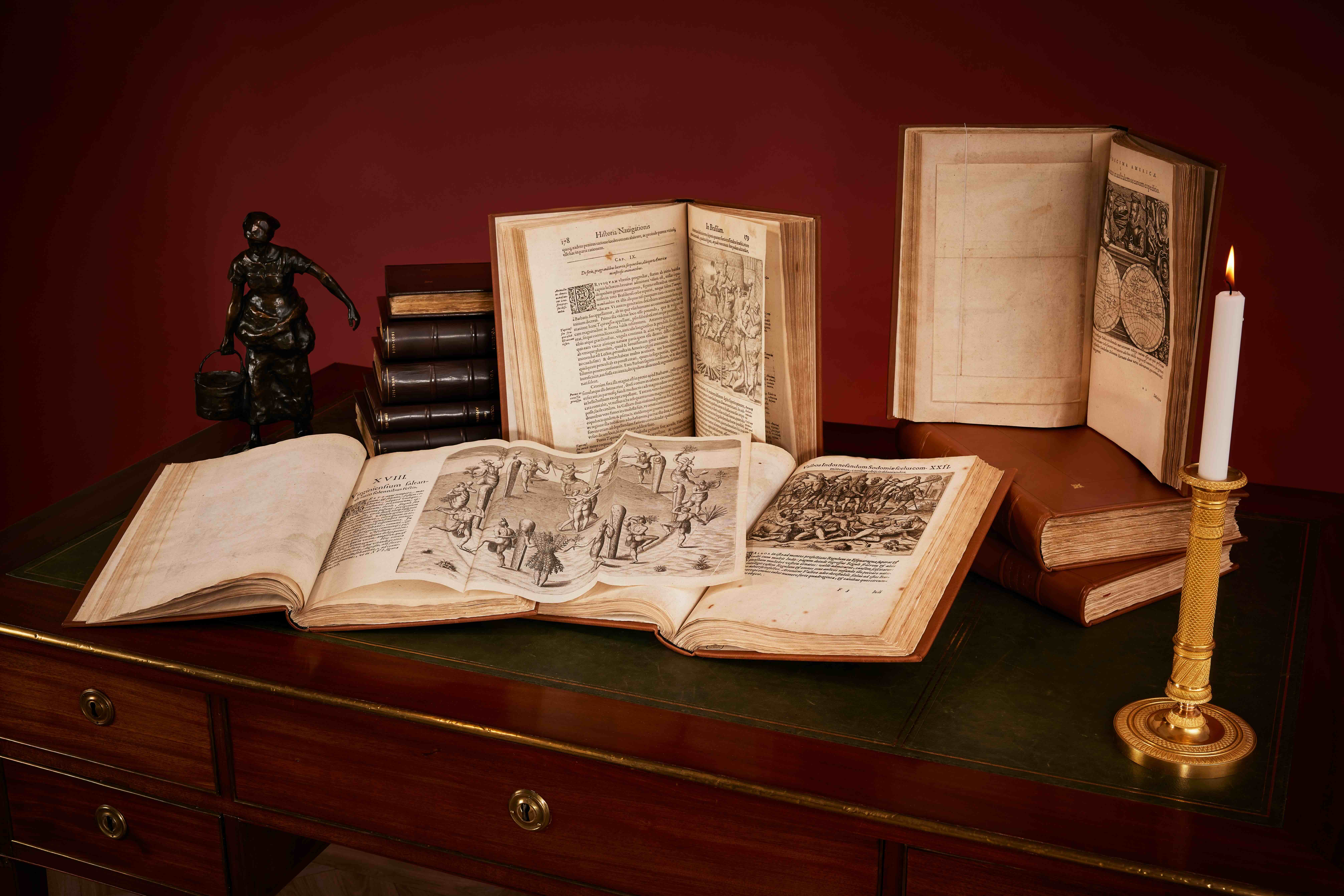 En av höjdpunkterna är naturligtvis holländaren Theodor De Brys fantastiska samling resor till den Nya Världen, främst Amerika och Asien, som kom ut 1590-1634. Verket, som kallas The Great & Small Voyages, förekommer ytterst sällan komplett, och innehåller viktiga reseskildringar av kända resenärer som Hariot, Linschoten, Drake, Vespucci, Barents och många fler. Vi erbjuder också Axel Stakes opublicerade manuskript om en berömd ballongresa, S. A. Andrées berömda polarfärd som inte riktigt gick som den var tänkt.