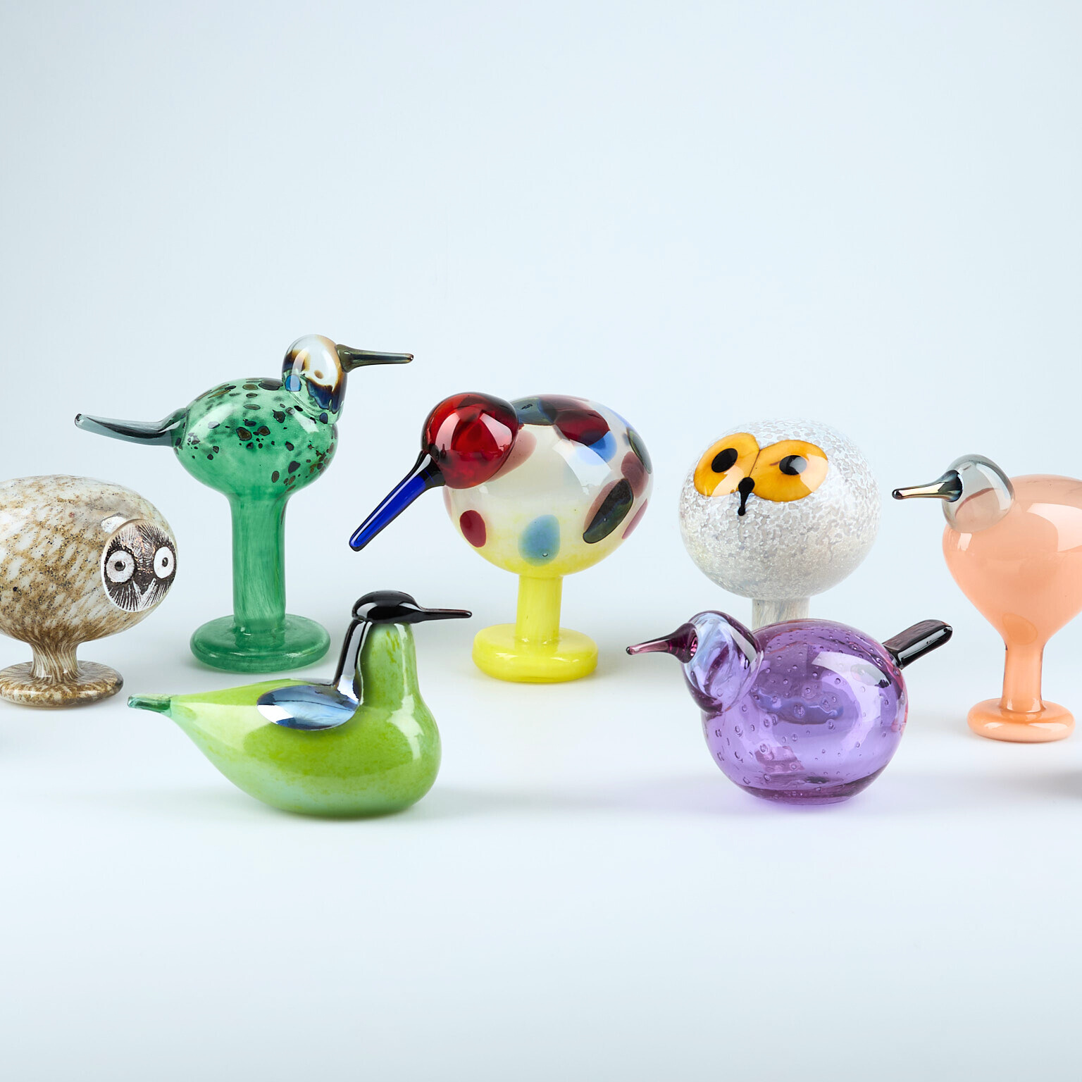 Oiva Toikkas glasfåglar är ikoniska samlarobjekt som kännetecknas av sina unika former, livfulla färger och detaljerade mönster. Varje fågel är ett konstverk i sig, omsorgsfullt friblåst och format enligt traditionella glasblåsningstekniker. Hitta din favorit bland över 60 nummer och låt en tidlös designfågel flytta in i ditt hem!