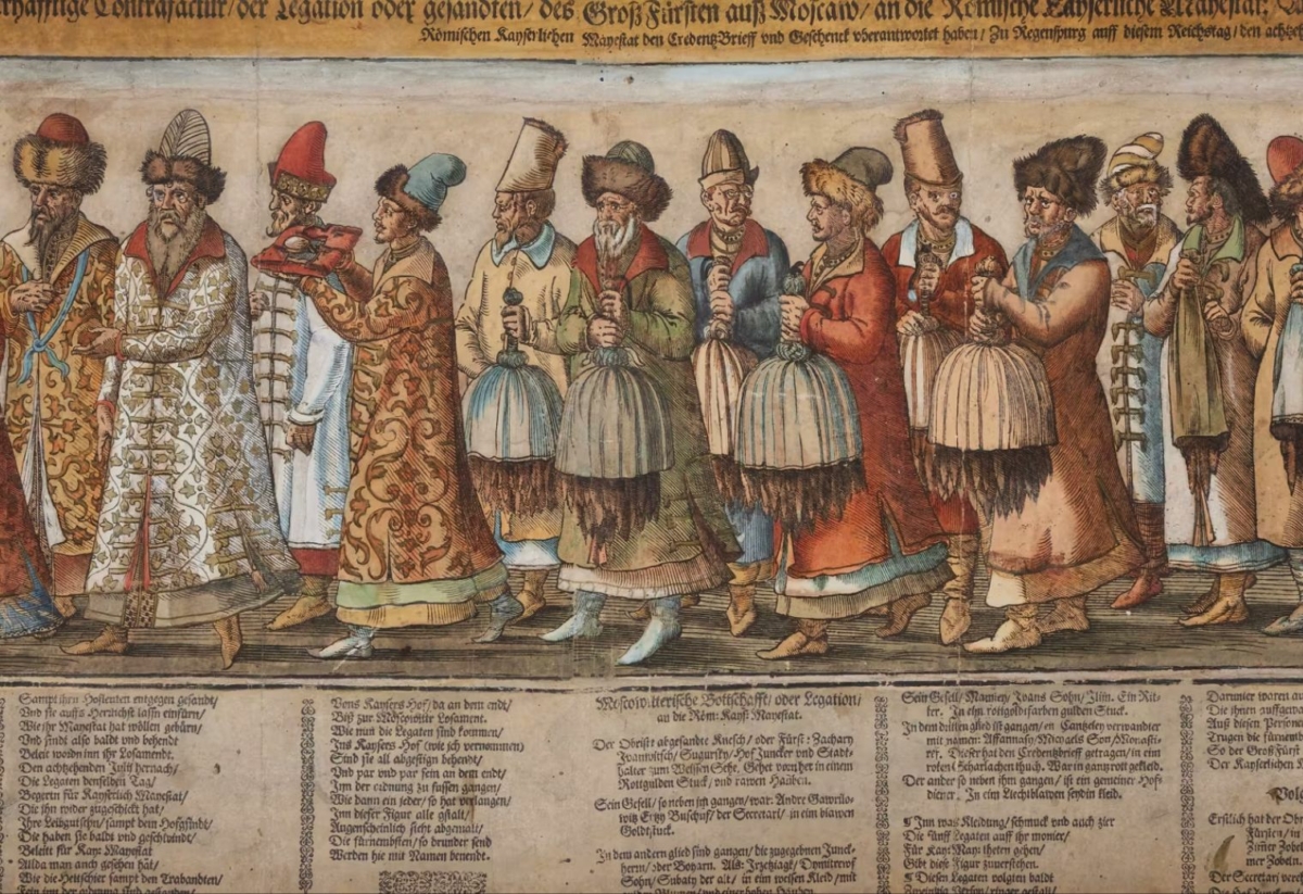 Några andra ryska resenärer, som var ett par hundra år före både den sällsynta atlasen och Gustaf Nobel, går att se i det utsökt detaljerade träsnittet från 1500-talets Prag. Det föreställer ryska ambassadörer från Ivan IV:s hov på väg att möta den tysk-romerska kejsaren Maximilian II i Regensburg 1576, där en lång procession av adelsmän och präster kommer bärandes på gåvor och dyrbara pälsverk. Senare reproduktioner av snittet, som tryckts under 1800-talet, finns att se på bibliotek och museum, på bland annat Victoria and Albert Museum i London och Bibliotheque des Arts Decoratifs i Paris.