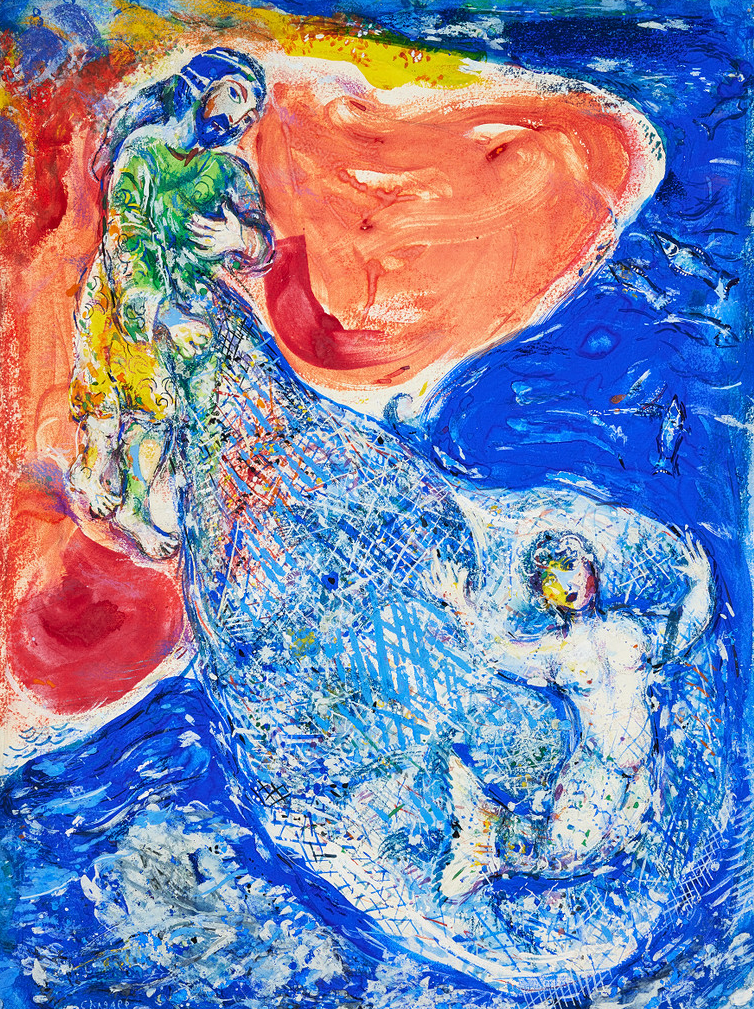 Som en glimmande ädelsten i ett praktfullt smycke ter sig den färgsprakande målningen ”När Abdullah fick i land sitt nät”, vilken ingår i en serie av tretton gouacher ur ”Tusen och en Natt”. Konstnären låter i denna svit minnen från sitt österländska ursprung klinga samman med de drömsyner som texten i de underbara sagorna framkallade för hans inre öga. Sällan har Chagall givit sin koloristiska fantasi och konstnärliga virtuositet så fria tyglar som i denna spektakulära målning.