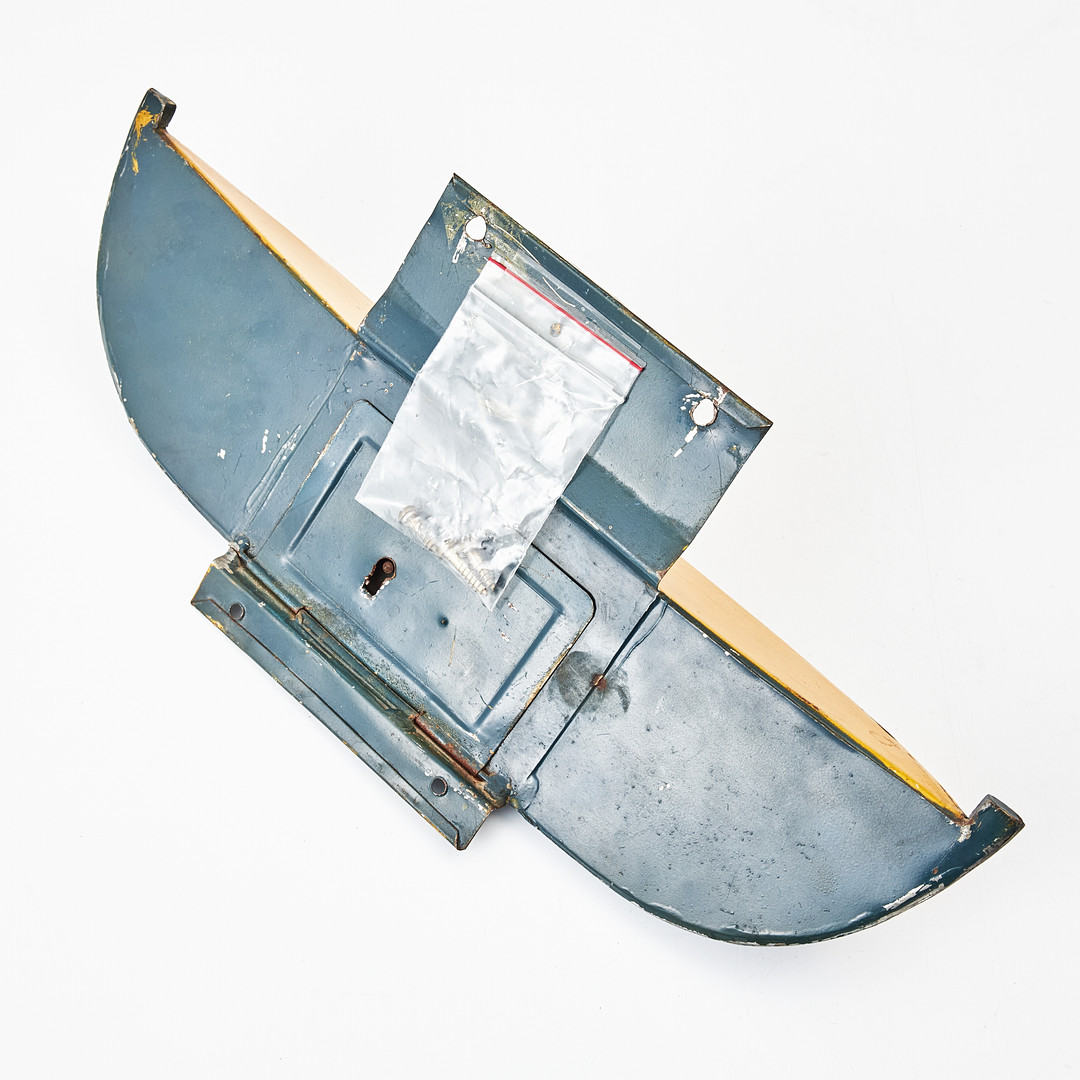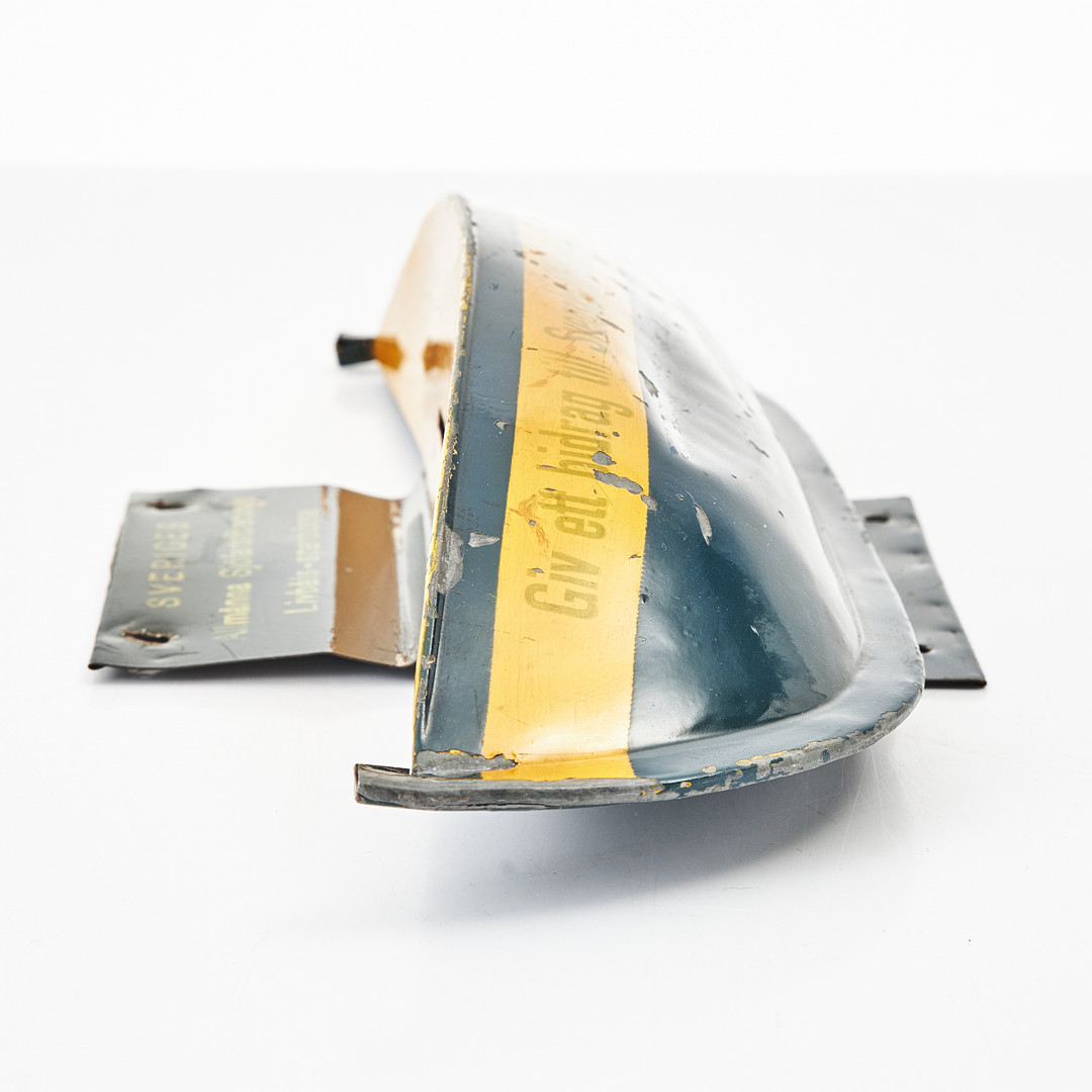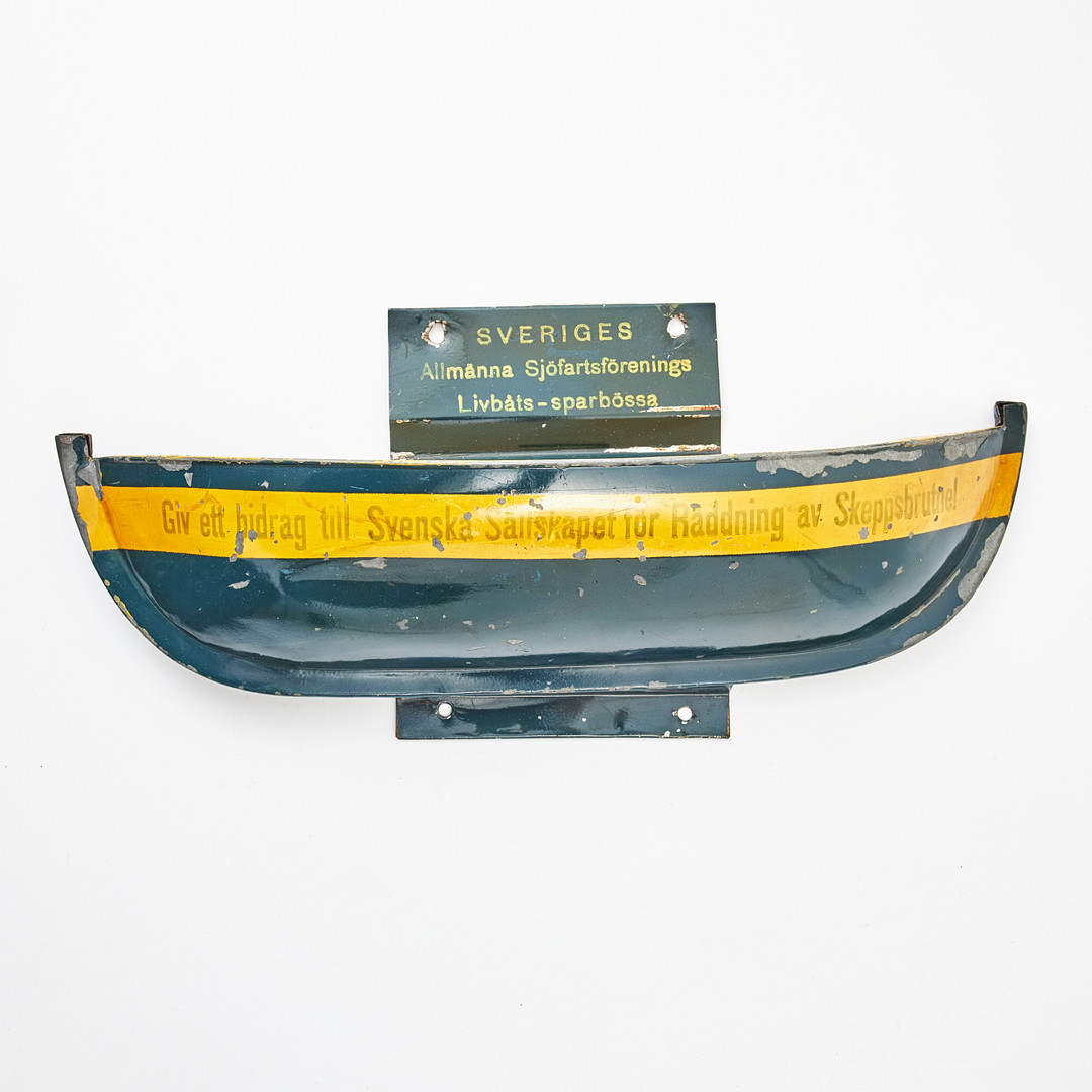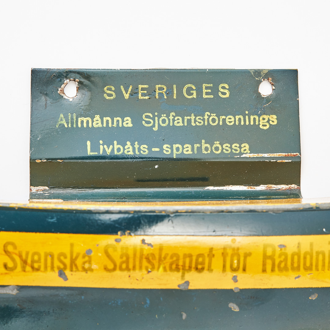 INSAMLINGSBÖSSA, Sveriges Allmänna Sjöfartsförenings Livbåts-sparbössa, Svenska sällskapet för Räddning av Skeppsbrutna, för upphängning på vägg eller stativ, bemålad metall, 1900-talets början.