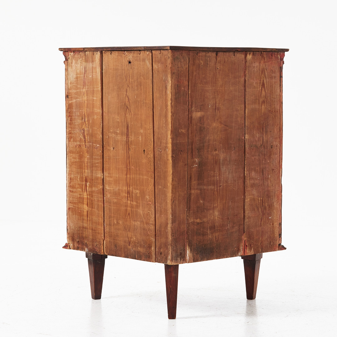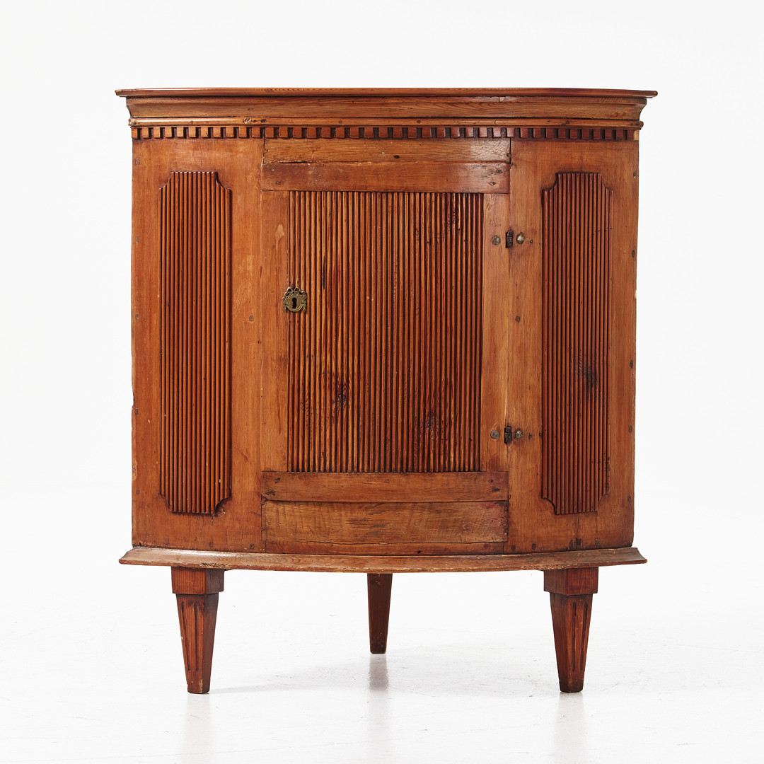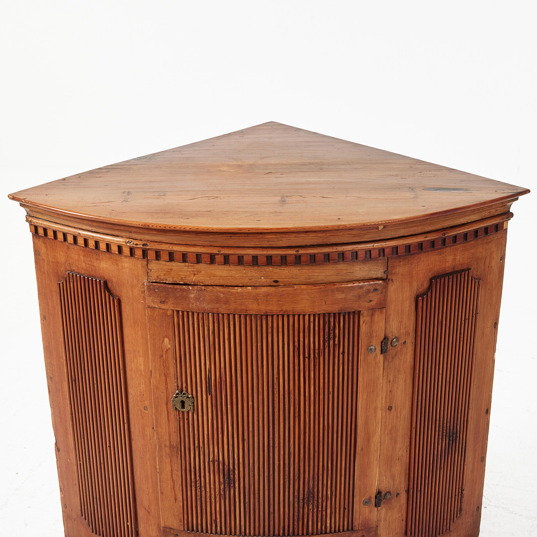 HÖRNSKÅP, 1700-talets slut, gustavianskt, räfflade speglar, tandsnitt, ben med kannelyr, nyckelskylt i mässing.
