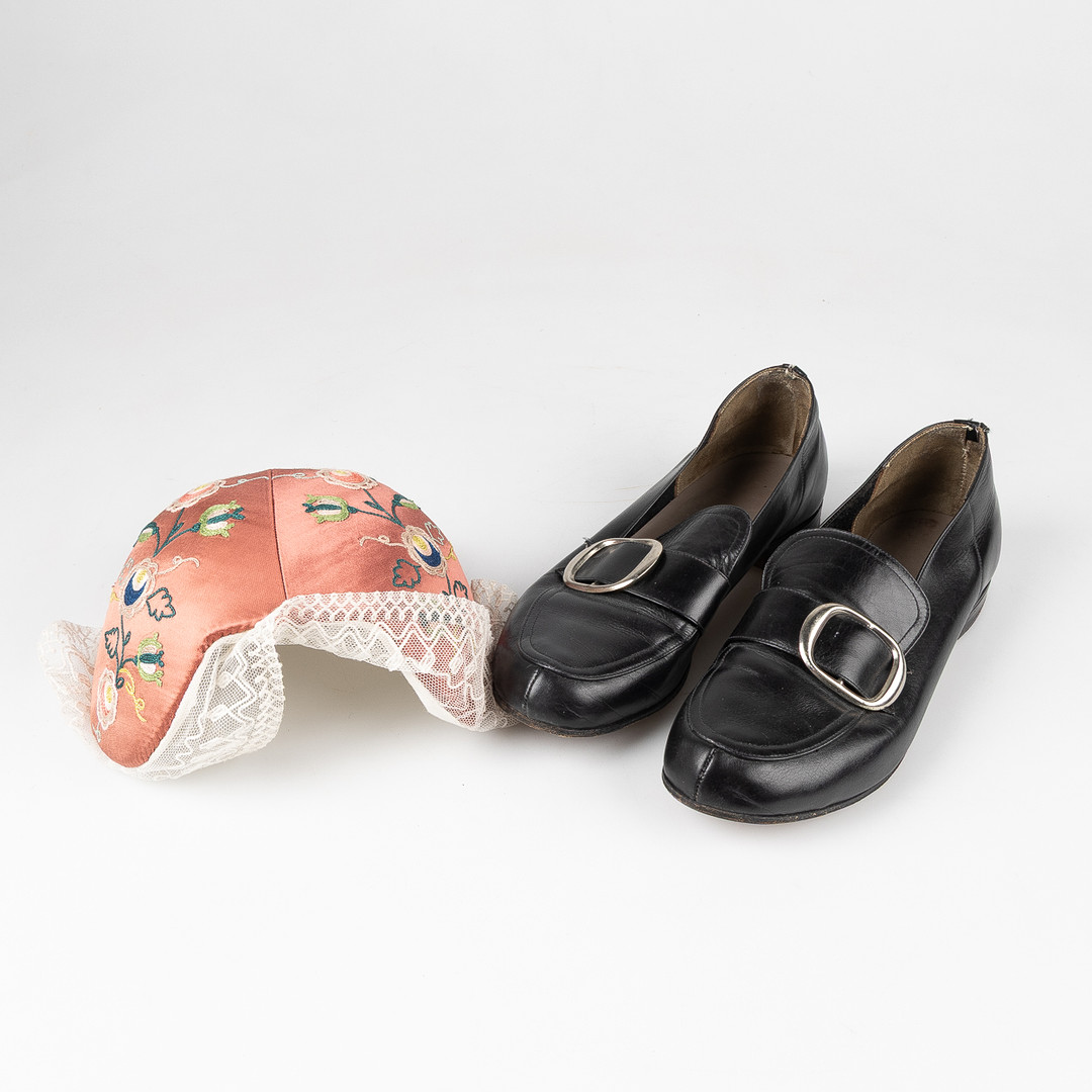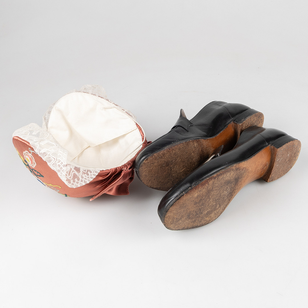 Bruksslitage. Fläckar på förkläde och halskläde. Konstläder vid spänne på skor har brustit.