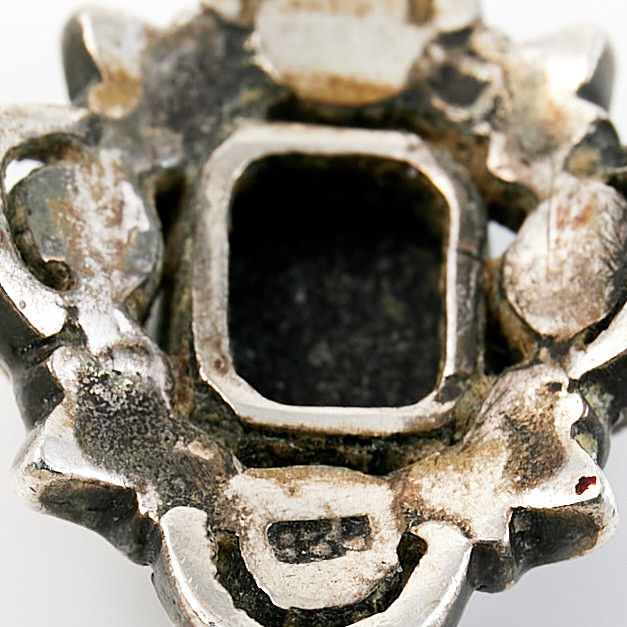 Bruksslitage, agat med fasettnagg, 1 markasit saknas, 2 markasiter med skador/sprickor, bucklig.