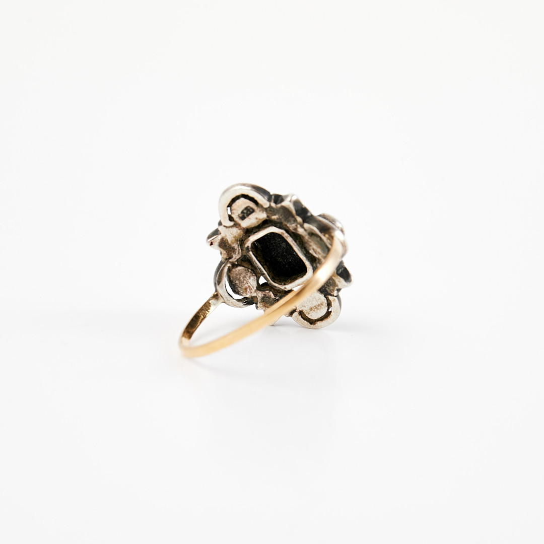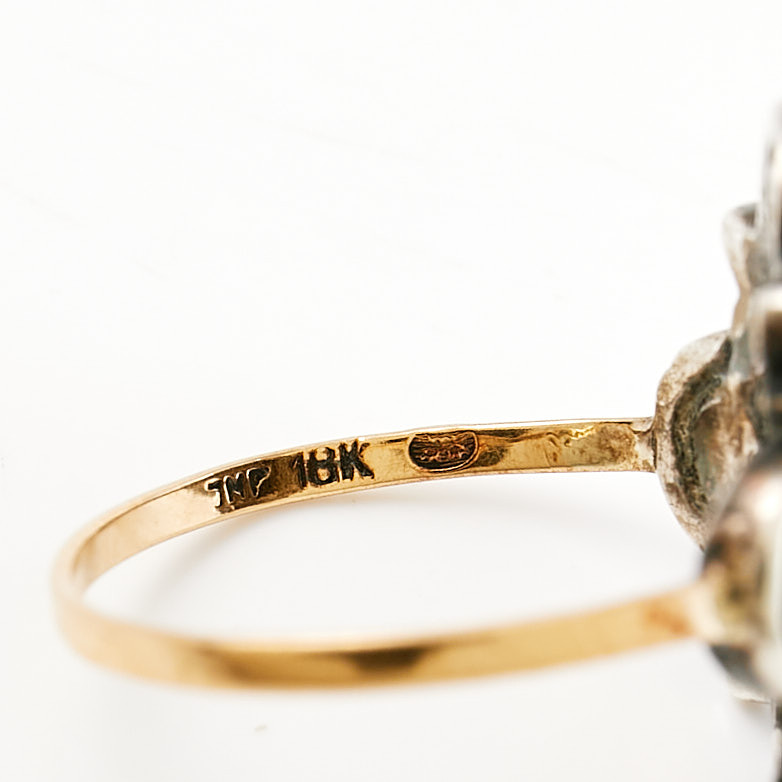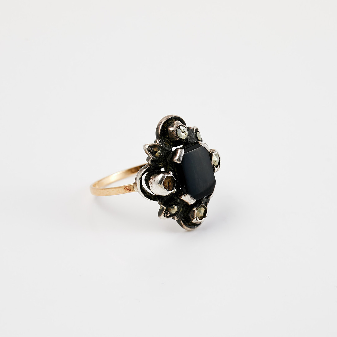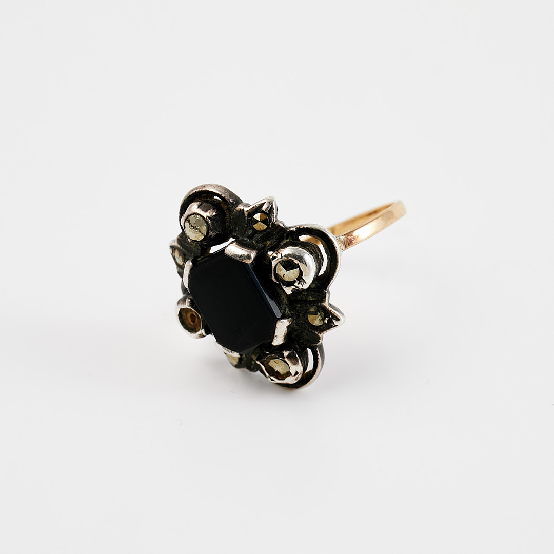 RING, 18 k guld/silver, 1 planslipad svart agat, fasettslipade markasiter, svenska importstämplar.