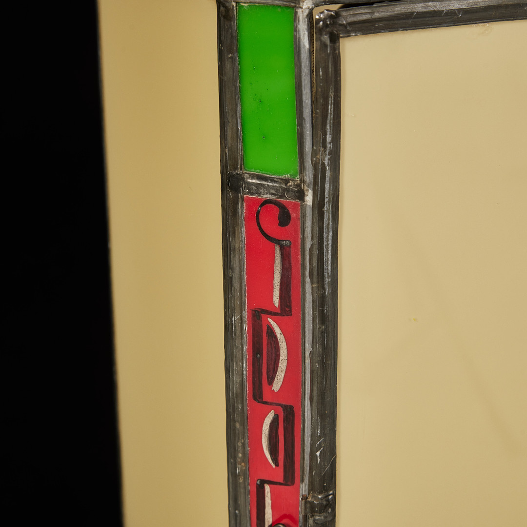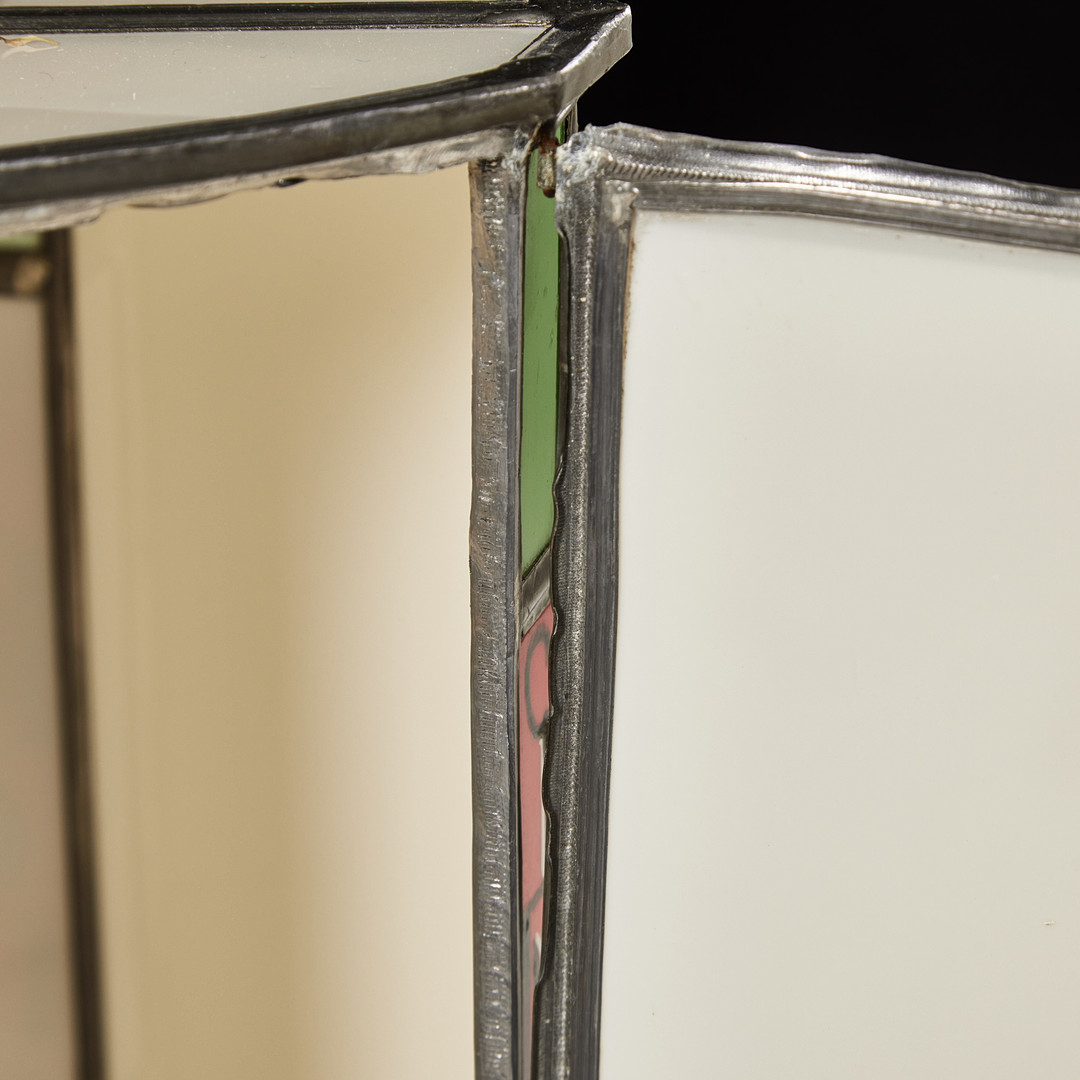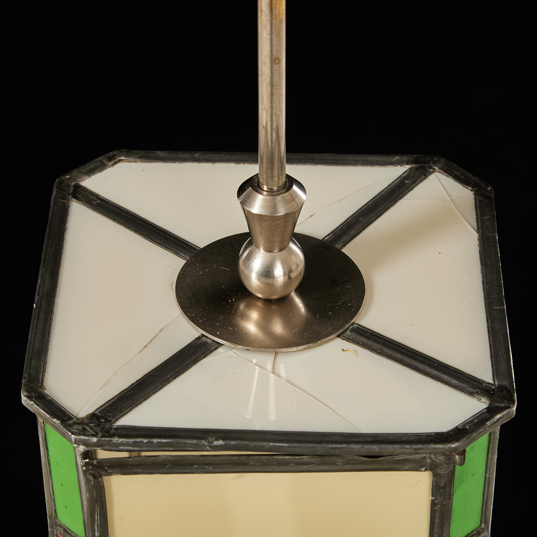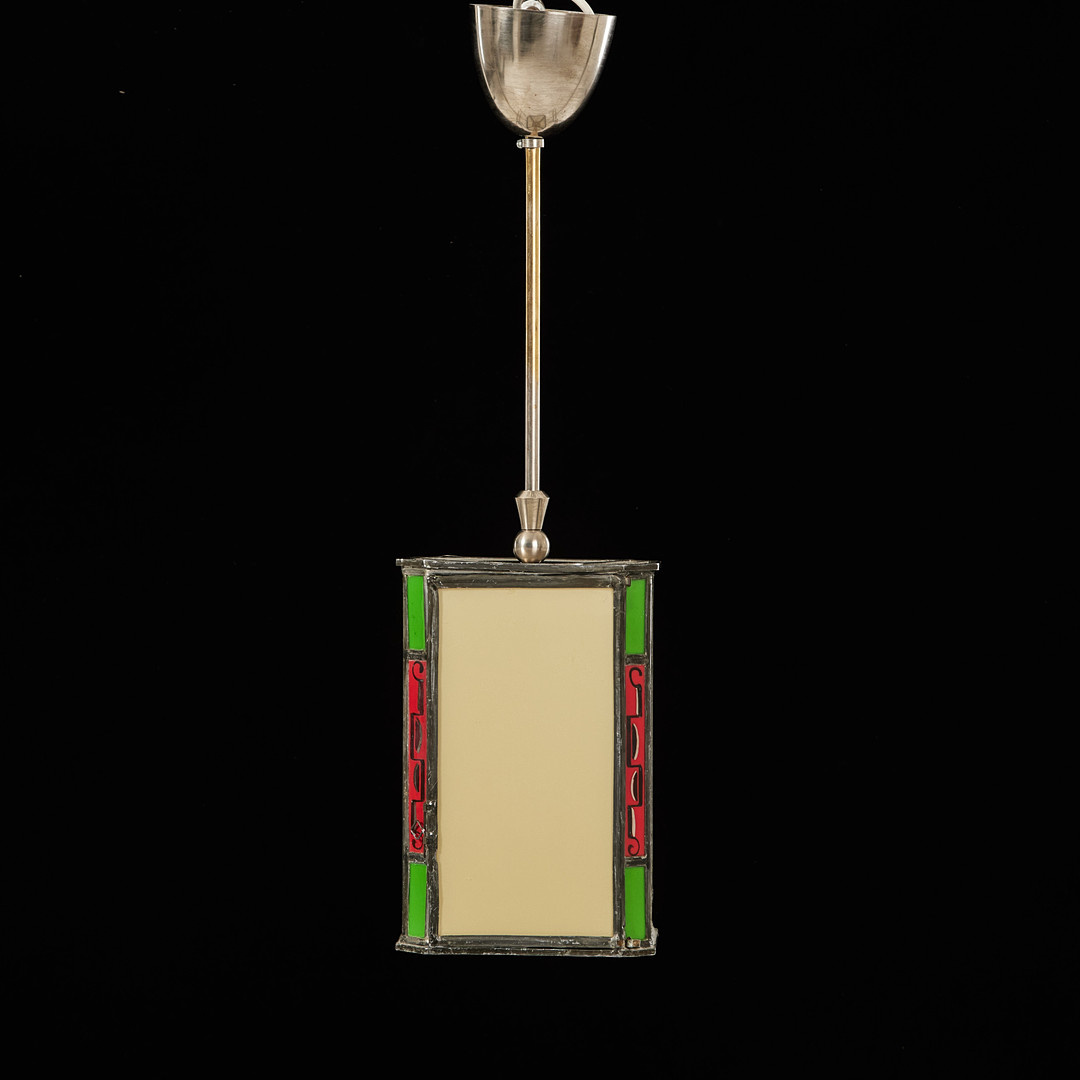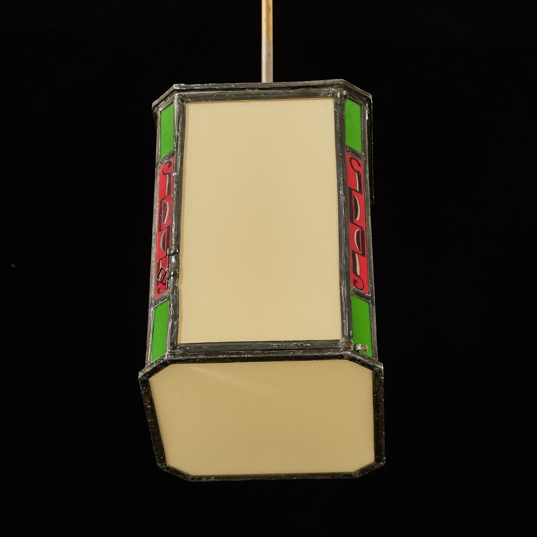 TAKLAMPA, lykta, art deco, ca 1930-tal, kvadratisk form med fasade hörn, blyinfattade glas, hörnen med handmålad dekor.